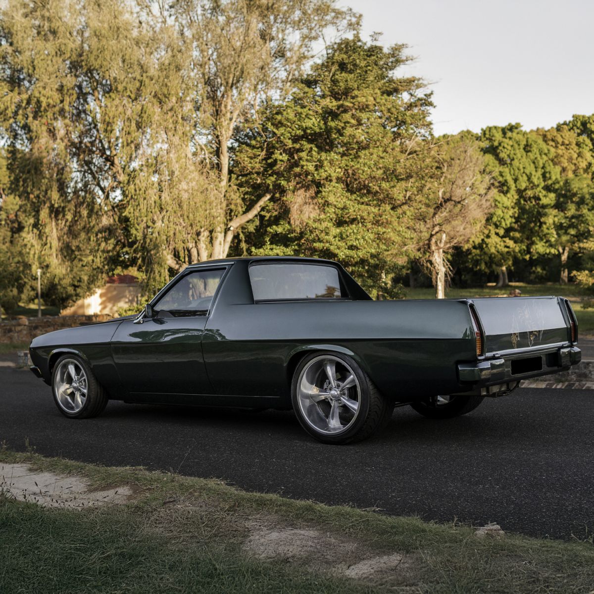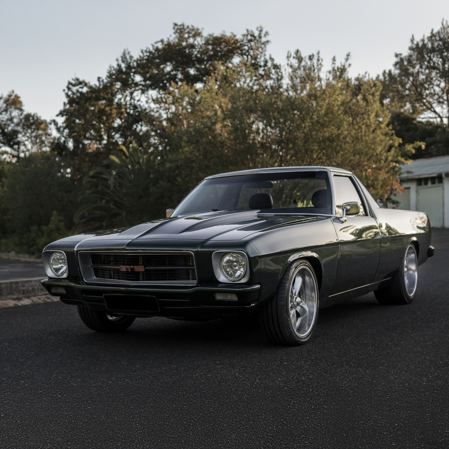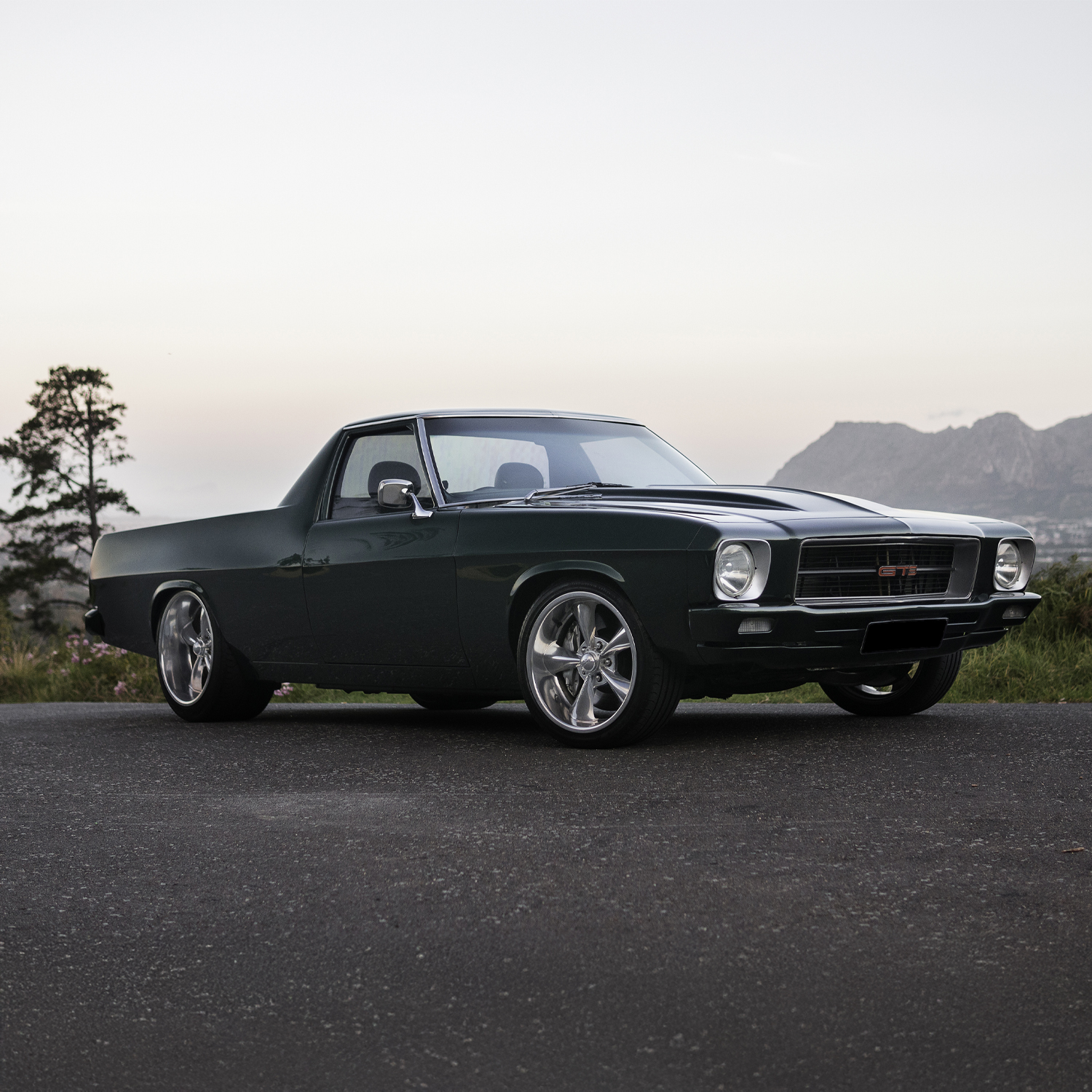 With the metalwork complete, attention shifted to fabrication. The chassis was narrowed and the inner guards tubbed to accommodate massive 20x12-inch wheels at the rear. Scott was very clear about the stance he wanted, aggressive but clean, with no visual clutter. Door handles were shaved and replaced with poppers, rear running lights and bumpers were tightened up for a cleaner fit, and a 2-inch reverse cowl was added to the bonnet to hint at what was hiding underneath. Paint was handled by Reynolds Auto Care in Cape Town, finished in a deep emerald green with a subtle pearl that brings the colour to life in the sun. The choice of green was deliberate, staying close to the original base colour that Scott fell in love with the first time he saw the car. Subtle pinstriping on the cowl and detailed airbrushing on the tailgate finish it off perfectly. A HQ Holden GTS grille was also imported to complete the front-end look.