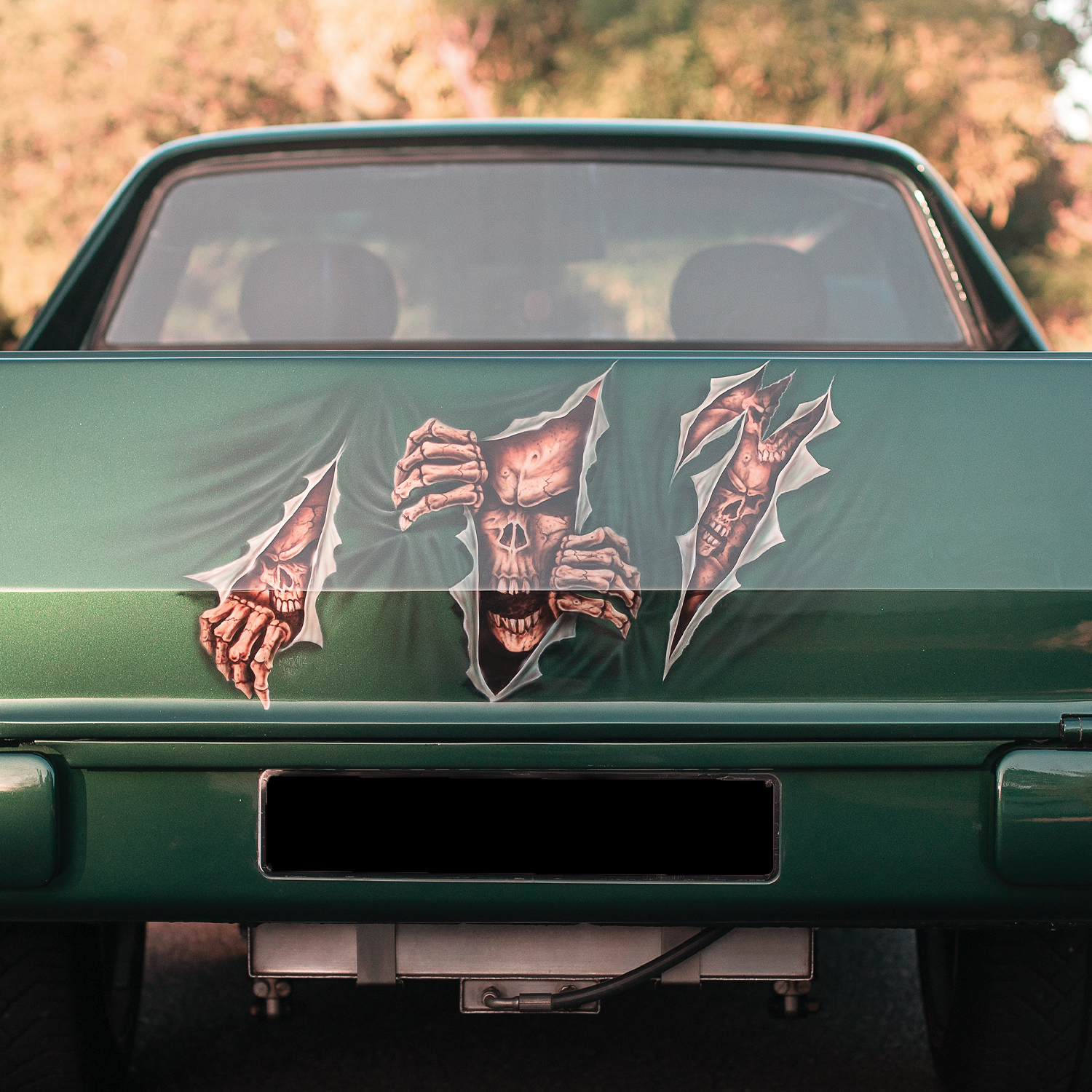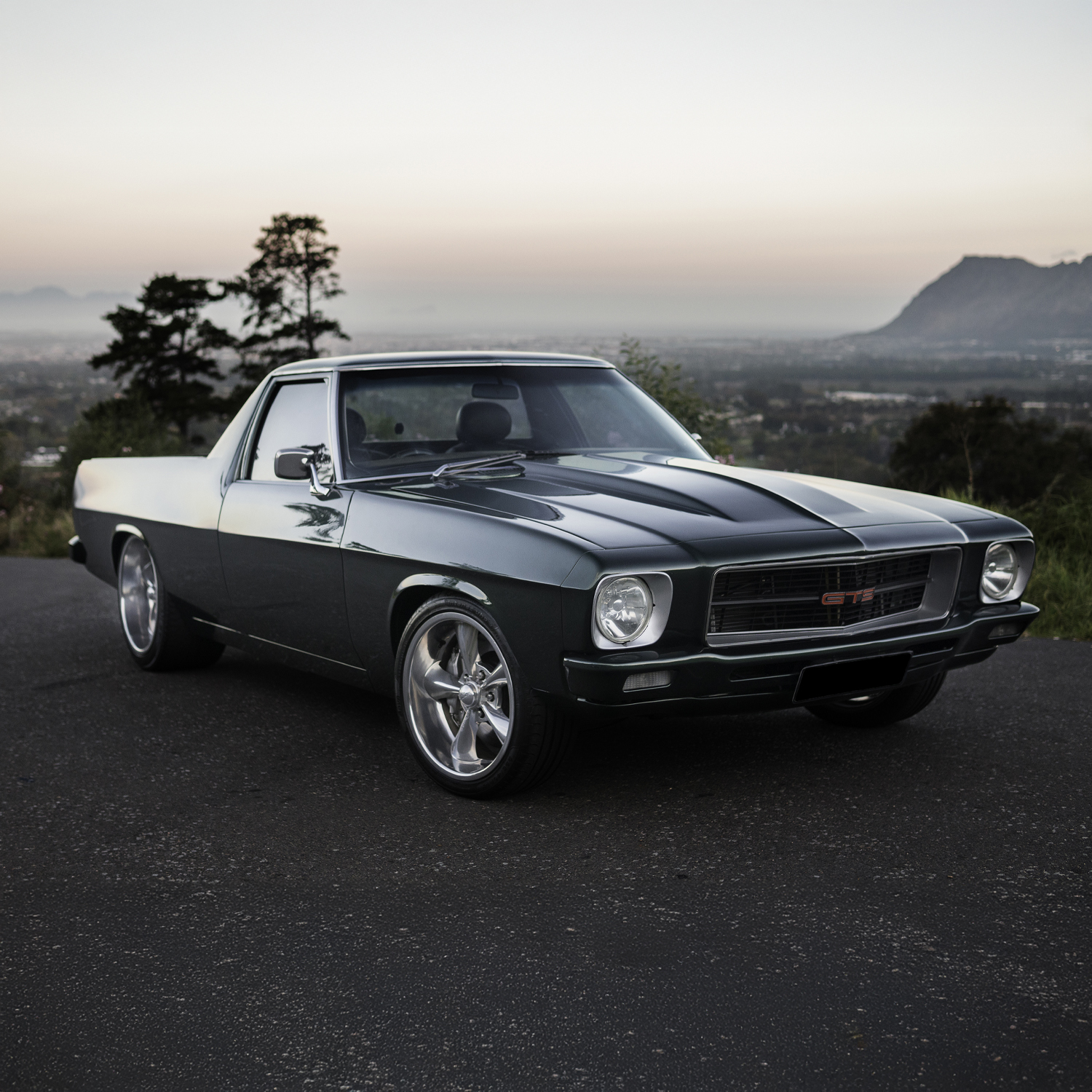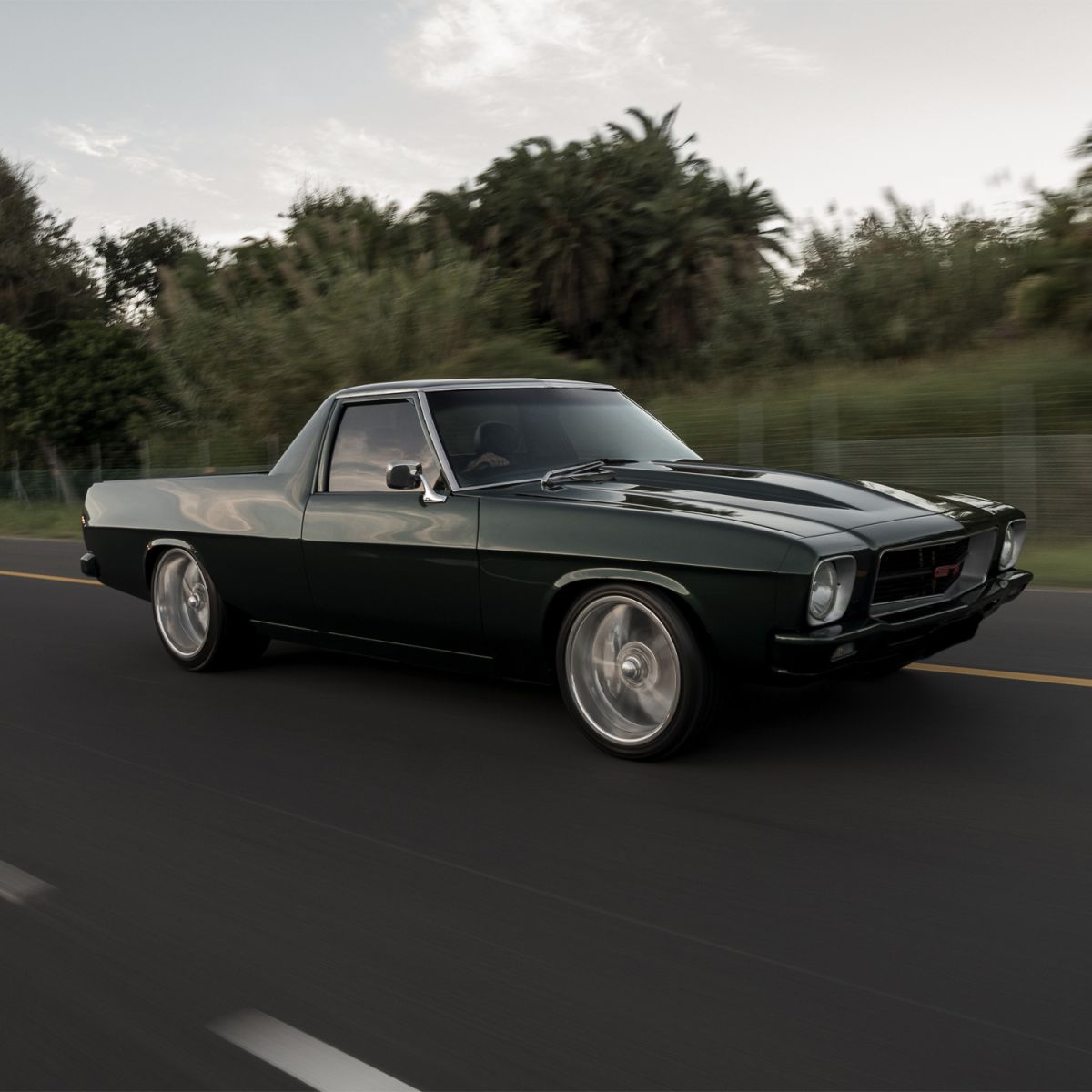 With the metalwork complete, attention shifted to fabrication. The chassis was narrowed and the inner guards tubbed to accommodate massive 20x12-inch wheels at the rear. Scott was very clear about the stance he wanted, aggressive but clean, with no visual clutter. Door handles were shaved and replaced with poppers, rear running lights and bumpers were tightened up for a cleaner fit, and a 2-inch reverse cowl was added to the bonnet to hint at what was hiding underneath. Paint was handled by Reynolds Auto Care in Cape Town, finished in a deep emerald green with a subtle pearl that brings the colour to life in the sun. The choice of green was deliberate, staying close to the original base colour that Scott fell in love with the first time he saw the car. Subtle pinstriping on the cowl and detailed airbrushing on the tailgate finish it off perfectly. A HQ Holden GTS grille was also imported to complete the front-end look.