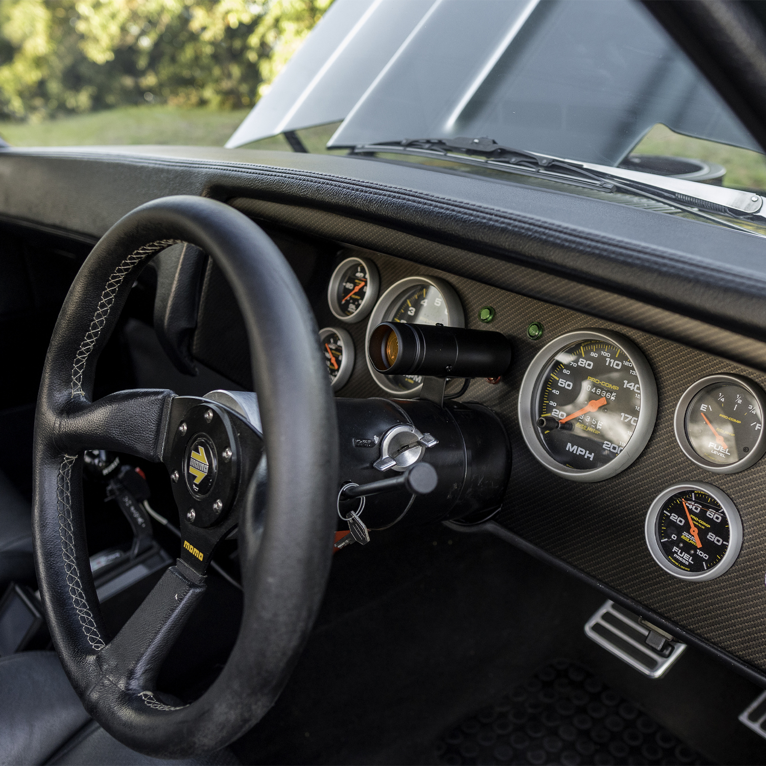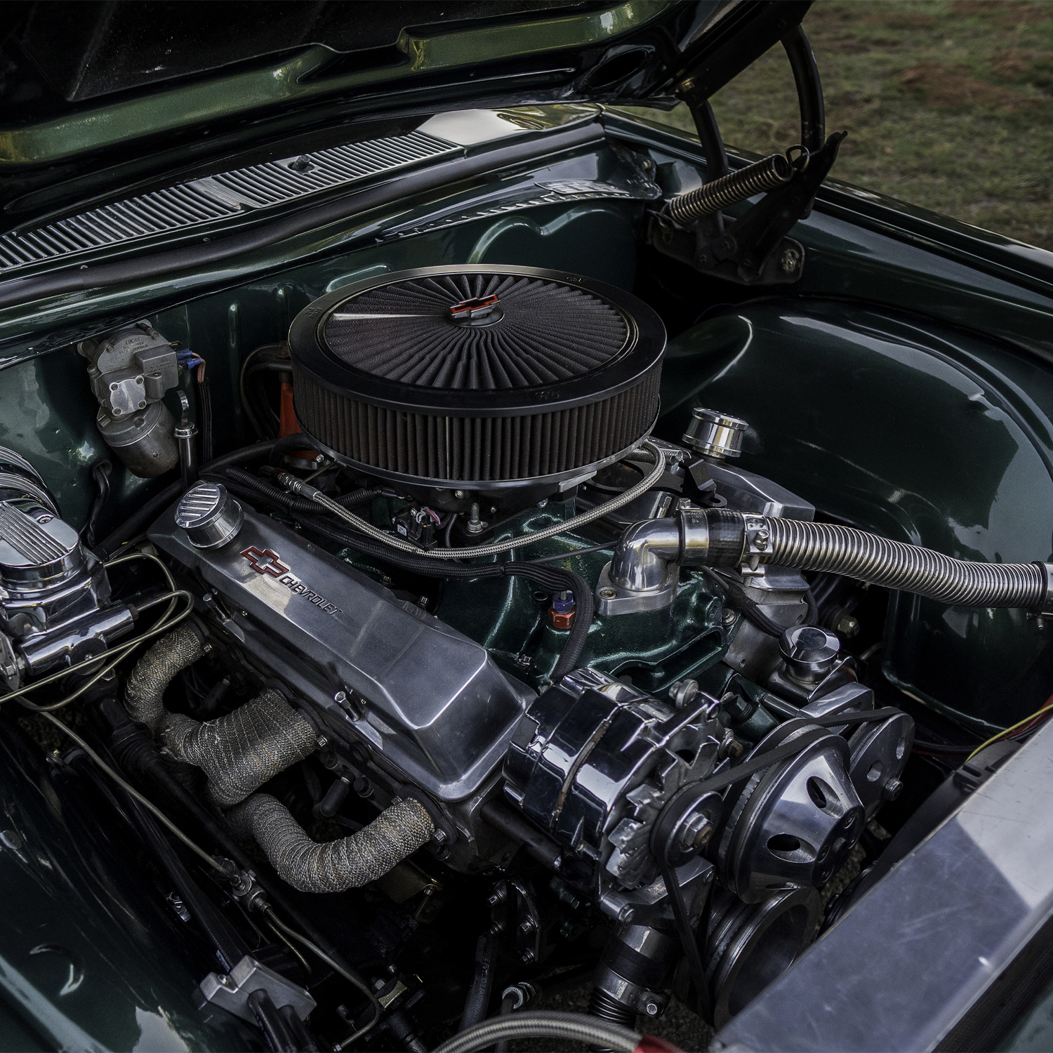 With the visuals sorted, the running gear had to match the attitude. The foundation is a virgin 350 four-bolt main block, built into a 383 stroker using Eagle internals, SRP forged pistons, ARP hardware throughout, and Pro Comp cylinder heads. Clevite bearings support the rotating assembly, while Comp hydraulic roller cams, roller rockers, and chromoly pushrods handle valve control. Ignition duties are managed by MSD, and airflow comes via a Victor Junior intake topped with a Holley Sniper EFI system. Exhaust gases exit through custom long-tube headers into a 3-inch stainless steel system with electric cut-outs, giving Scott the option of cruising quietly or letting the car announce itself properly.