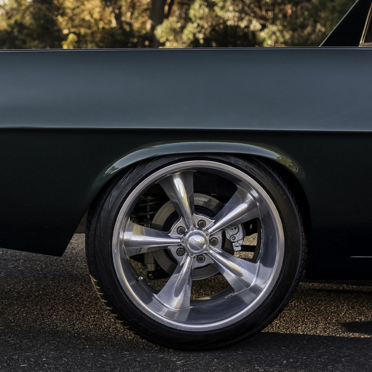 Wheel choice was critical to the overall stance. American Legend Streeter wheels were selected, sized to 18x7 inches up front and an imposing 22x12 inches at the rear. Wrapped in 225/40R18 tyres in front and 325/30R20 at the back, they fill the arches perfectly. The wheels were imported through Motown American Auto Parts and modified locally by Wheel Repair Centre in Cape Town.