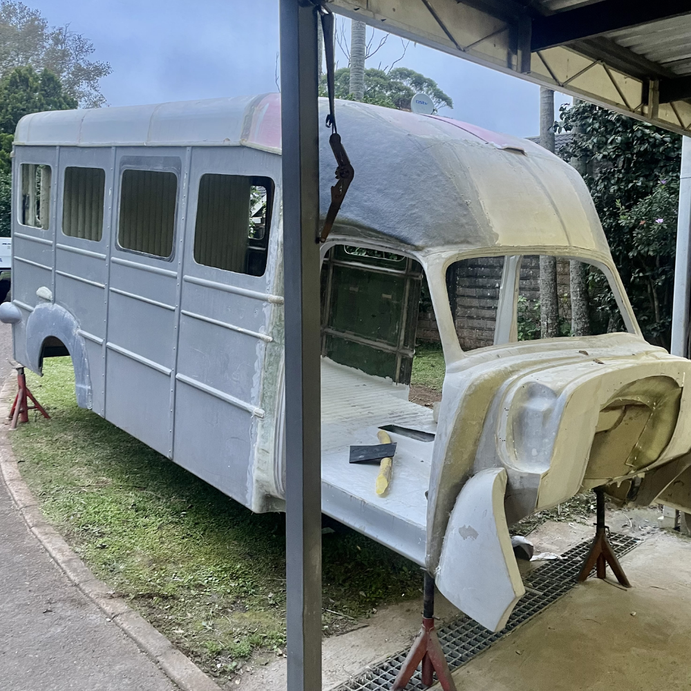 Rather than starting with a complete vehicle, much of the bodywork was crafted by hand. Over the course of three years, late nights and weekends were dedicated to making moulds, laminating fibreglass, and shaping panels to achieve the iconic school bus profile.