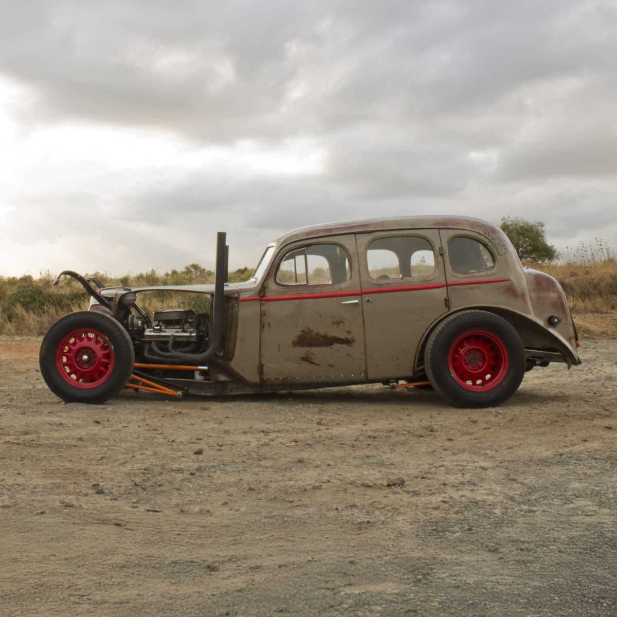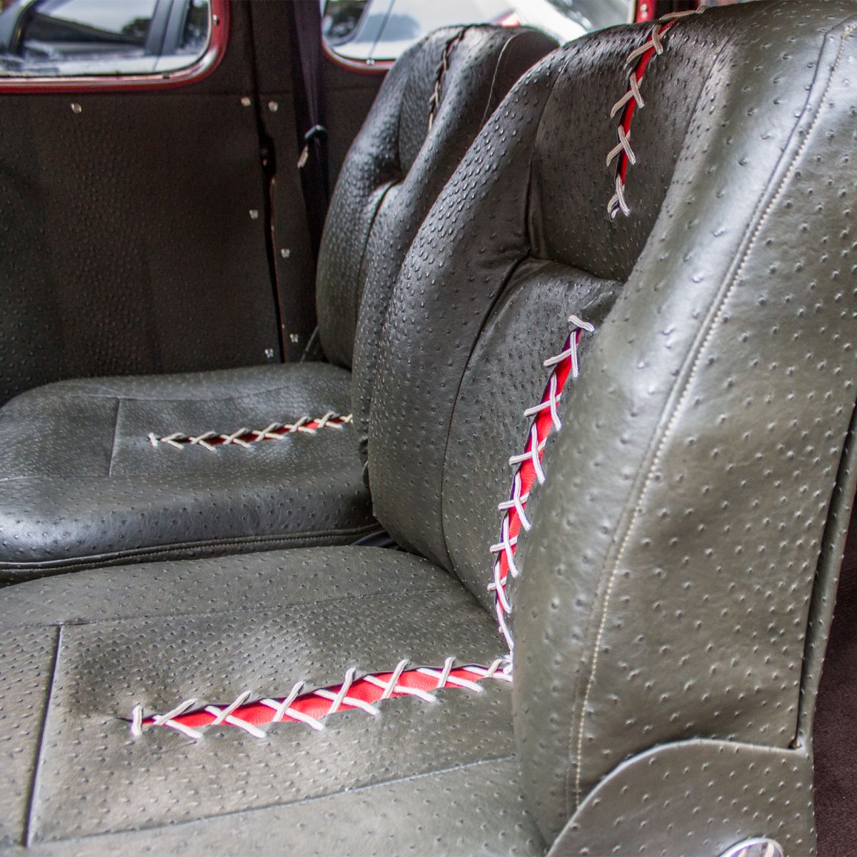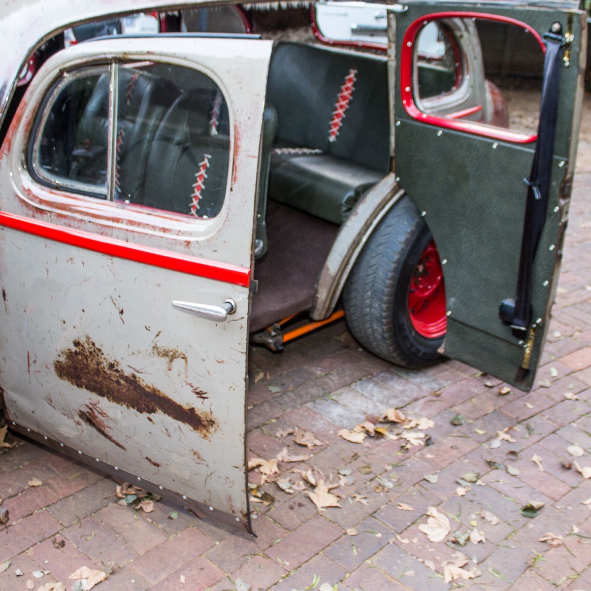 The floor was completely gone, so Danie fabricated a new one that could house the propshaft, internally mounted air suspension and rear diff. The doors were rebuilt from within, retaining only their skins. The center B-pillar was removed to open up the cabin and give easier access, and the body was lowered onto the chassis to create its unmistakable stance. The original patina — more than eight decades of weathering — was preserved under clear coat rather than covered over. The chassis remains original, strengthened and sealed in clear as well.
