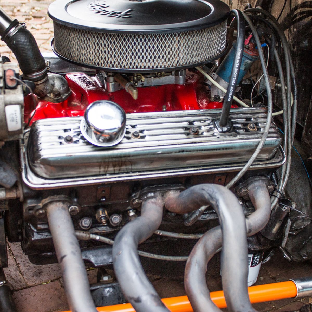 Under the hood is a Chevrolet 350 V8 sourced from Rocket 88. Danie rebuilt it himself with a 20-thou overbore and a 285-degree cam, while JBL Engineering in Pretoria handled the crank and head work. The gearbox is a Turbo 350 automatic from the same donor. Danie designed his own shifter system using two red levers on the tunnel, giving the interior a functional mechanical feel. The exhaust system is a sculptural piece of its own — balanced branches designed to look organic, with silencers hidden vertically in the uprights.