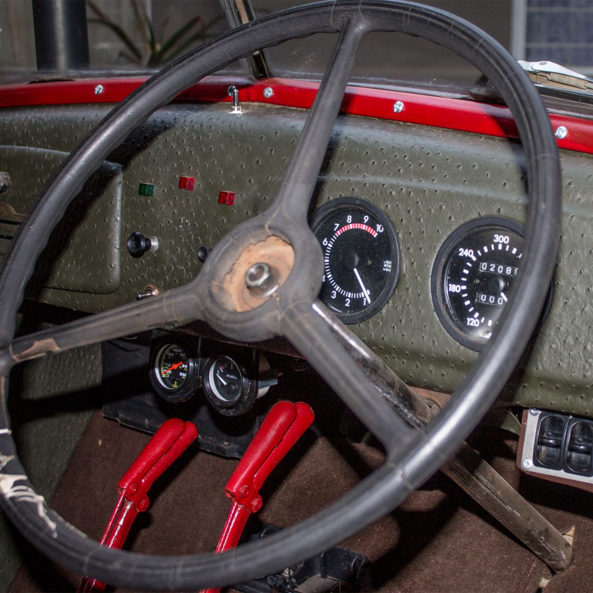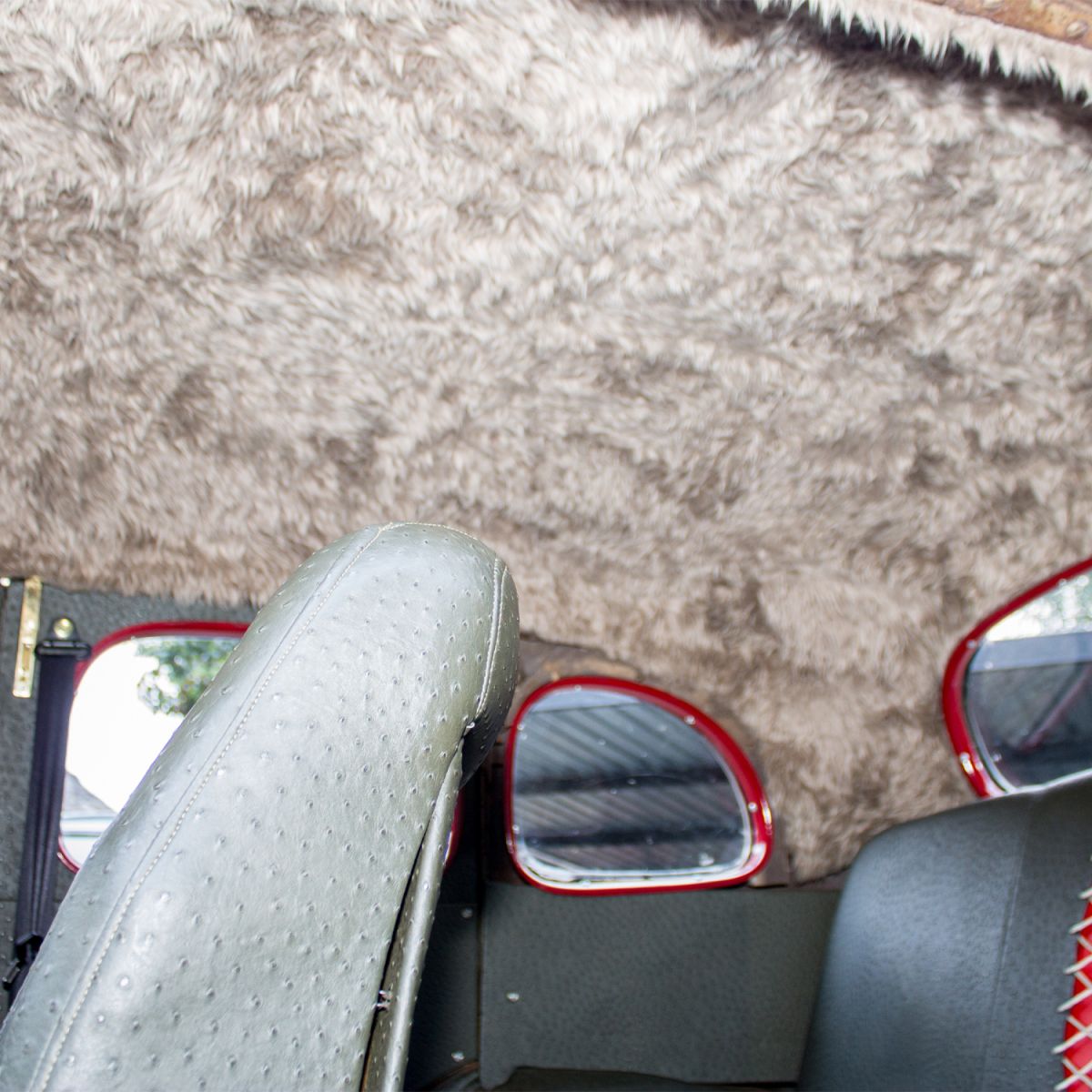 Inside, Danie’s vision continues. Unable to find an upholsterer who understood the direction, he learned the craft himself. The seats are trimmed in green ostrich leather with red inserts, the same leather wraps the dashboard, and the roof lining is finished in fur — originally used to hide mistakes, now one of the interior’s most striking elements. The result is a cabin that feels like stepping inside the creature hinted at by the exterior.