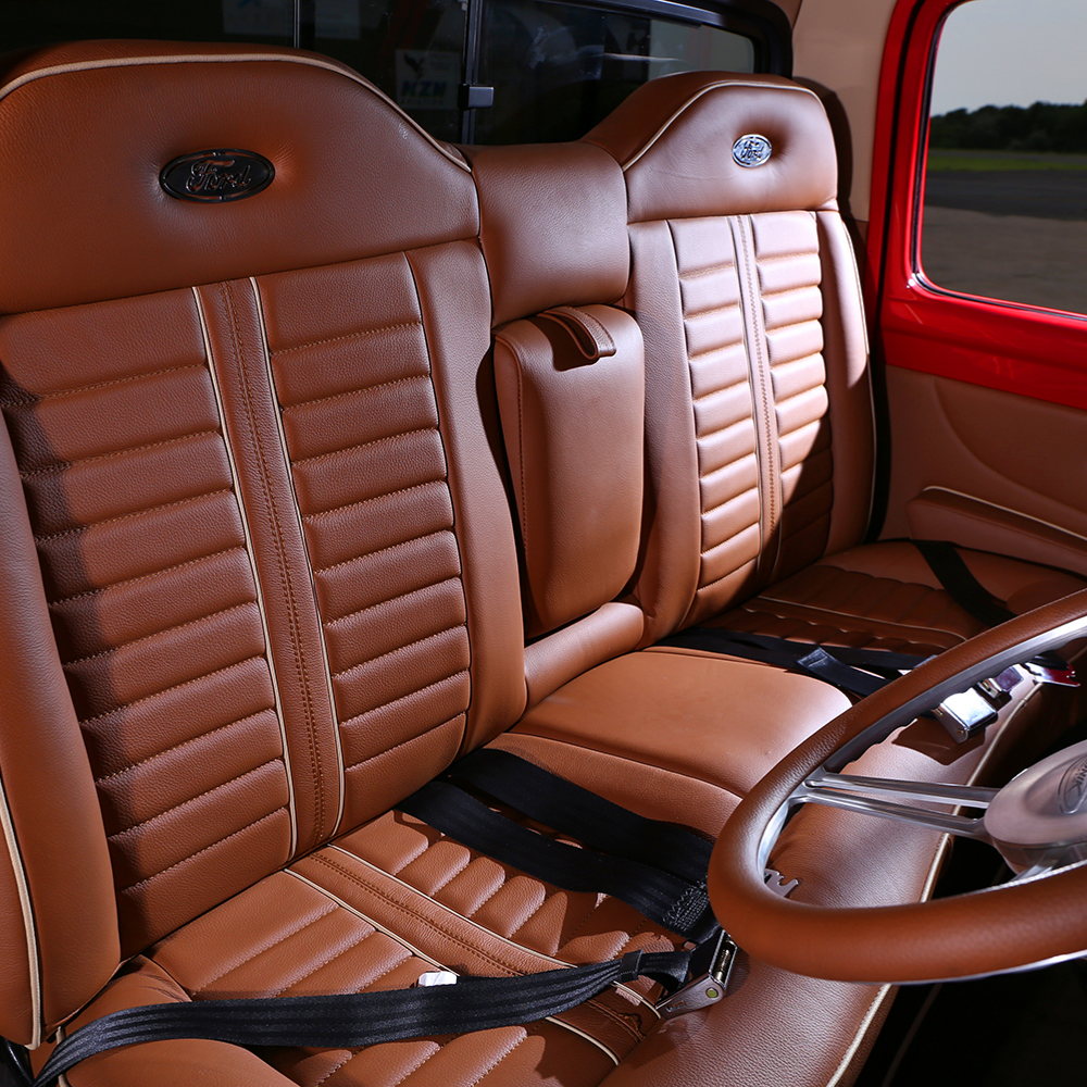 The truck’s deep red paintwork is perfectly complemented by the chrome accents across the exterior — from the grille and bumpers to the striking Shelby Cobra-style 18-inch American Racing wheels. The bed has also been beautifully finished with rosewood-stained marine-grade wood, which sits above a custom aluminium 97-litre fuel tank.