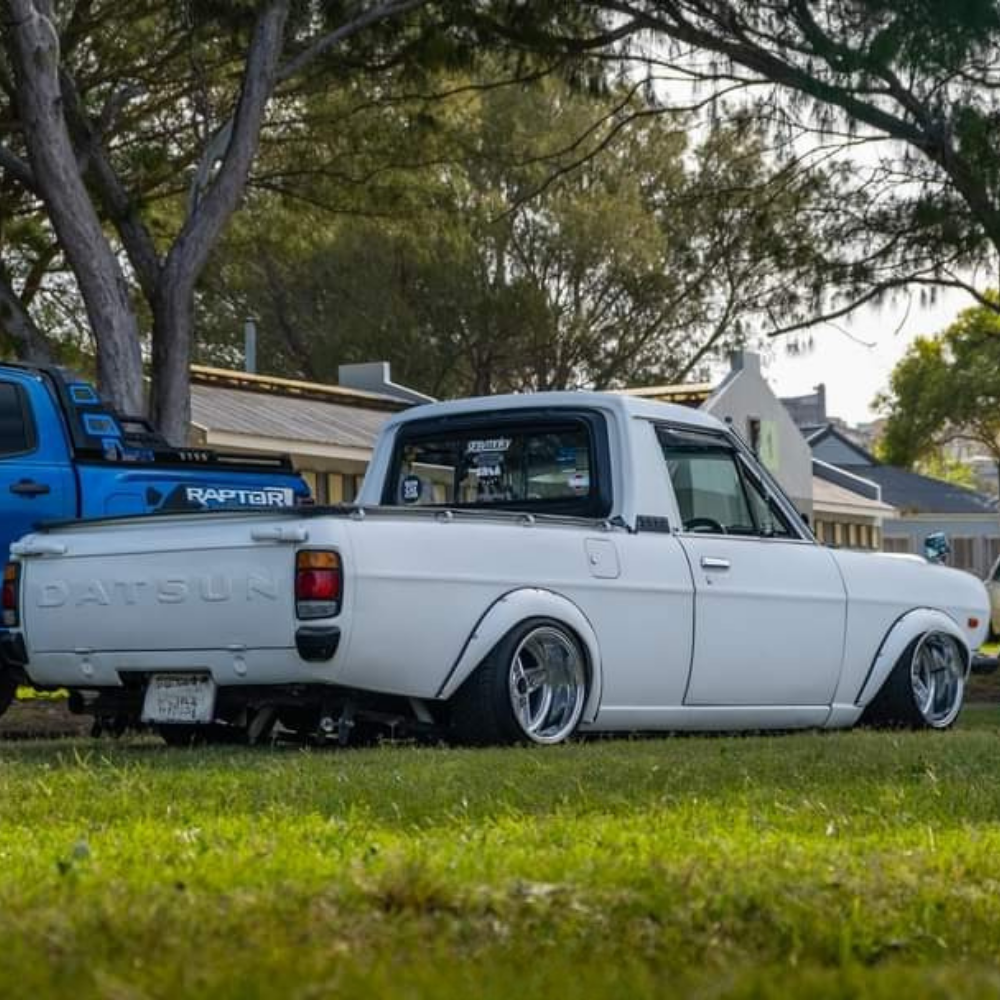 Details matter on a build like this. Datsun 510 fender mirrors replace the standard units, while the GX5 fiberglass bonnet (Japanese-spec) adds both weight savings and period-correct aggression. Overfenders widen the stance, giving Marlena the muscular presence she deserves, while the custom tailgate, finished with a Datsun 620 center section, ties the rear together with a factory-plus look that feels intentional, not forced.