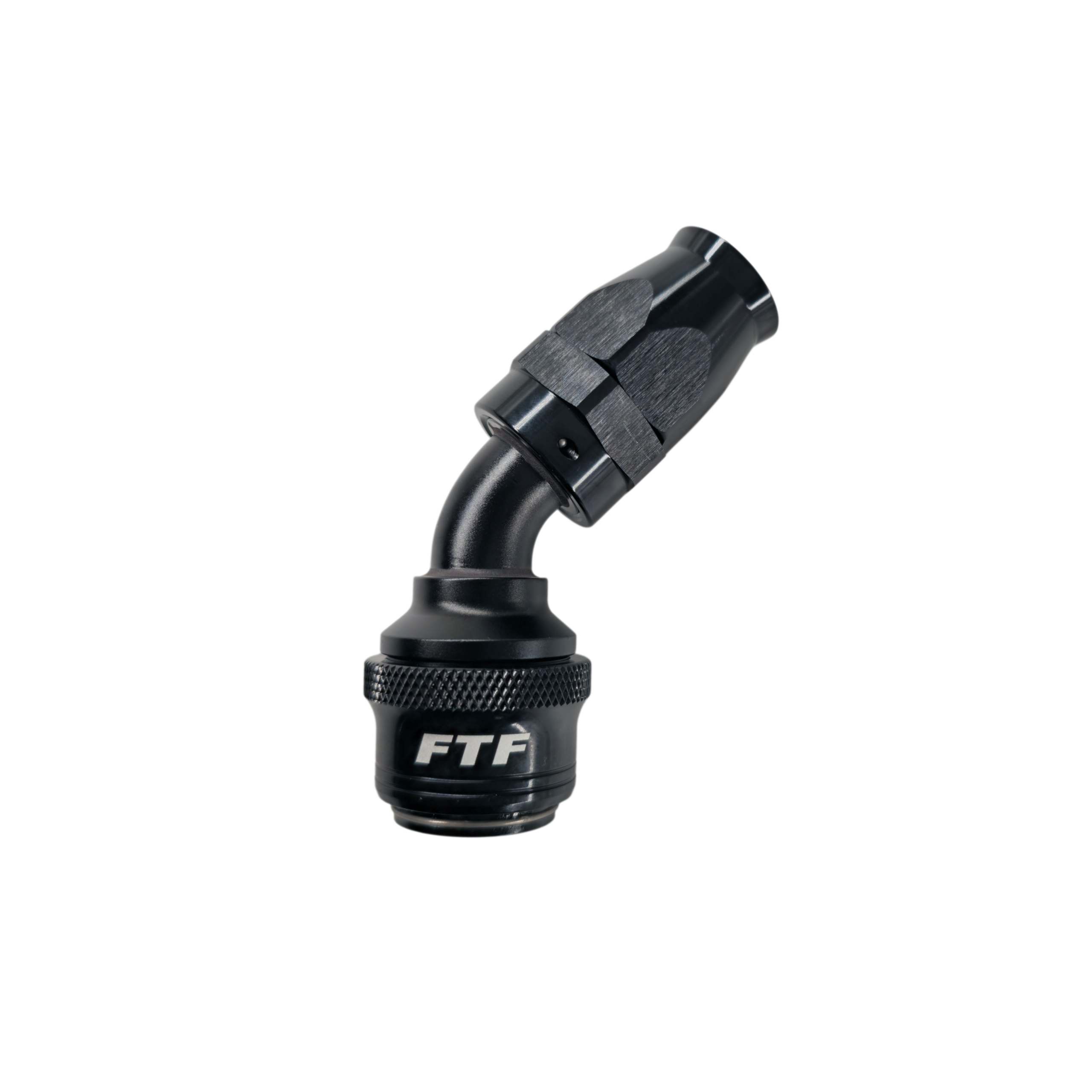 FTF Pro Range Quick Release 45° Hose End for PTFE/Teflon Lined Hose - AN10 Size\n\nPremium quick-disconnect hose end designed for ptfe/teflon lined applications. Perfect for professional installations requiring frequent maintenance access.\n\nKey Features:\n• High quality finish\n• Ease of use\n• Tool free, quick release mechanism\n• Spring loaded locking mechanism\n• Machined from 6061-T6 billet aluminium\n• Compatible with ptfe/teflon lined\n• AN10 thread size\n• 45° angled configuration\n• Corrosion resistant anodized finish\n• Leak-proof O-ring seal design\n\nApplications: Fuel systems, oil systems, coolant systems, brake systems, and other high-pressure fluid applications requiring quick disconnect capability.\n\nPart of the FTF Quick Release Pro Range - engineered for performance and reliability in demanding automotive applications.