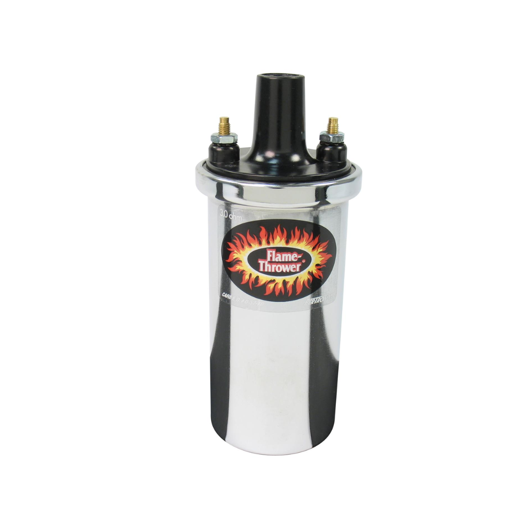 The **Pertronix Flame-Thrower Ignition Coil** is designed to complement Pertronix Ignitor systems, delivering high spark energy for improved performance. Available in 1.5 ohm (for systems without a ballast resistor) or 3.0 ohm (for systems with a ballast resistor), it ensures reliable ignition and efficient combustion in 12V applications.
