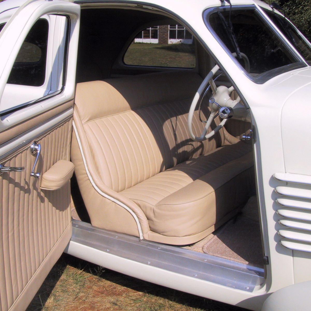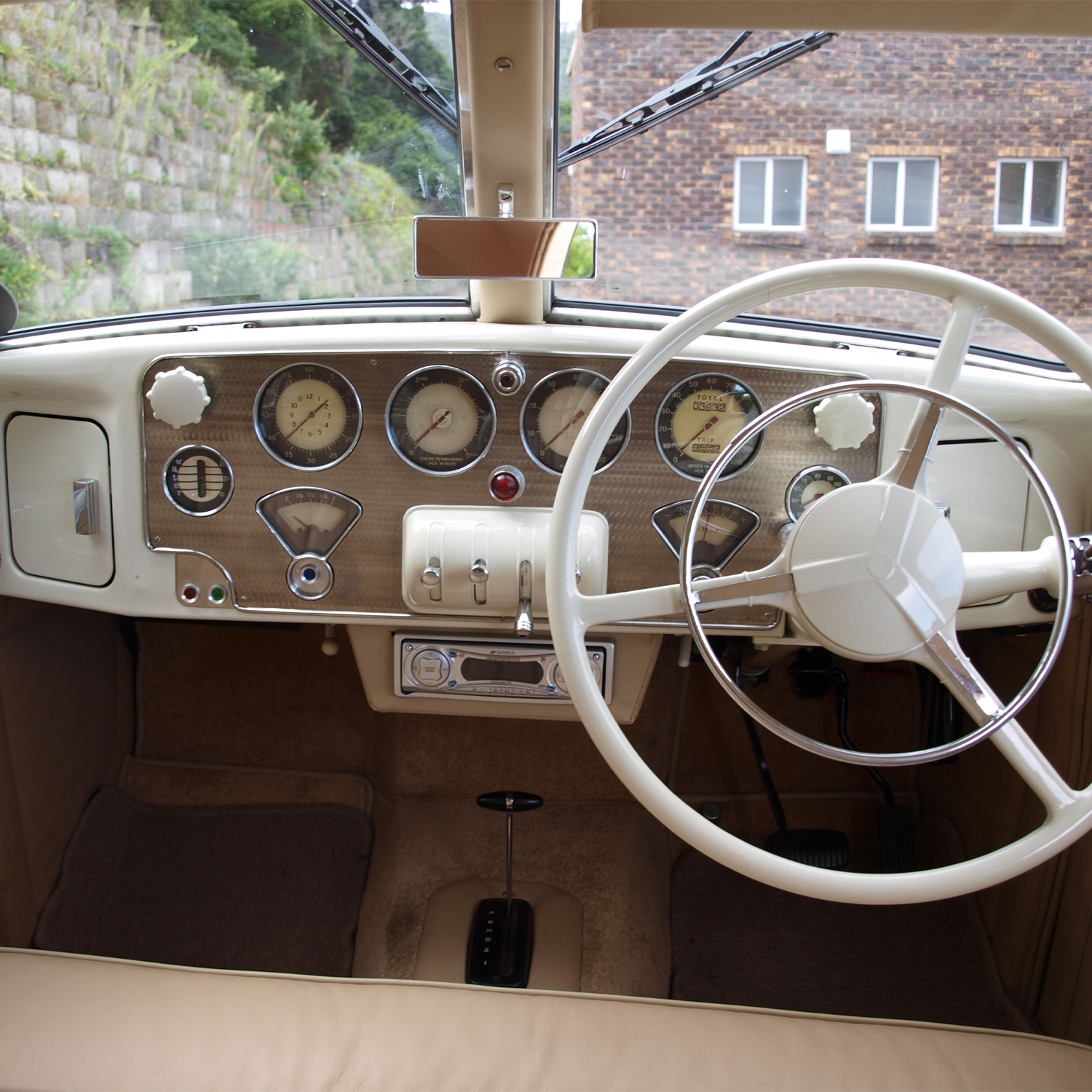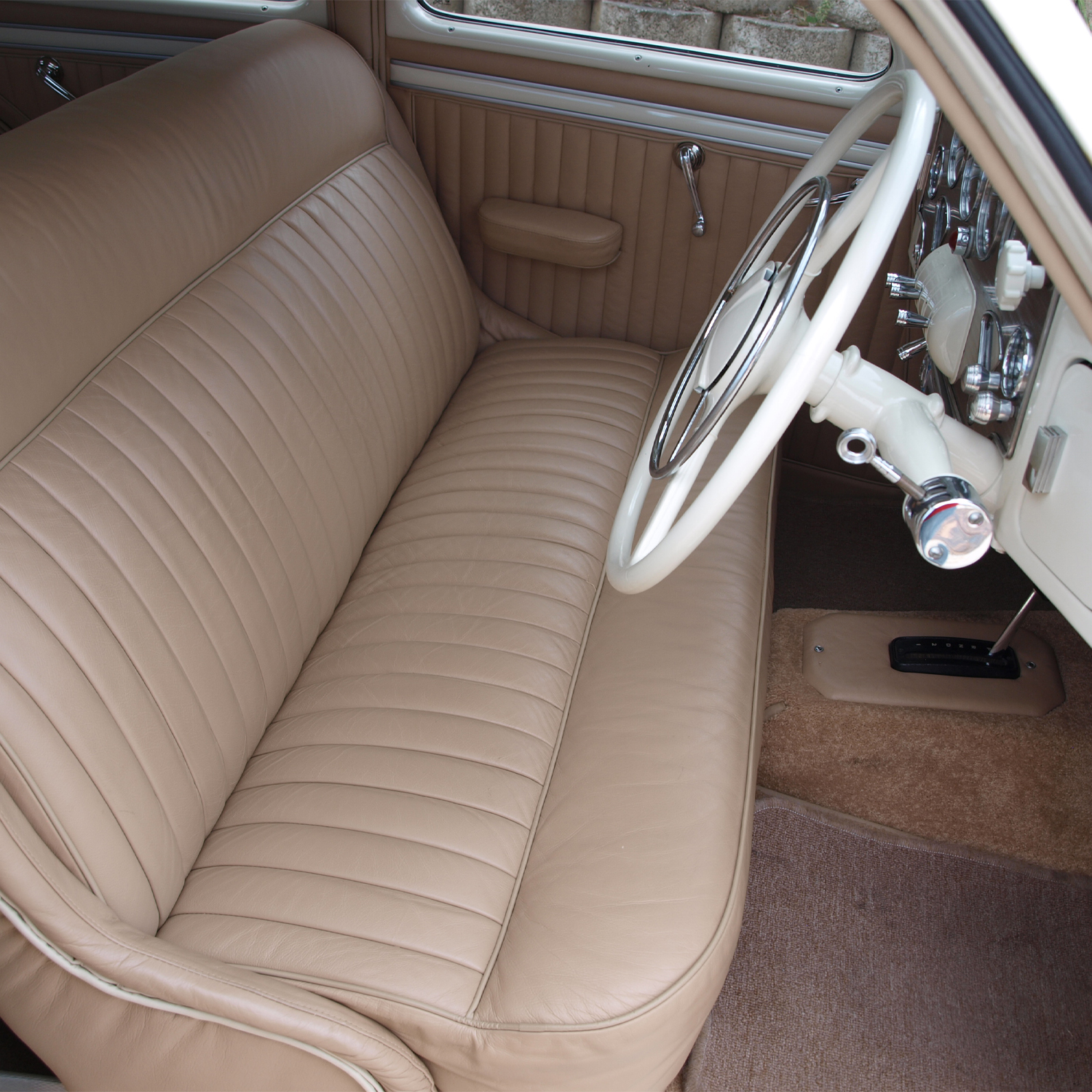 A replica gear stalk (props to Mike again), new woodwork inside, and a ring-polished stainless dash finished things off. The paint? BMW Mini Pepper White. The interior? Beige leather stitched to factory specs. Clean. Classic. Cord.