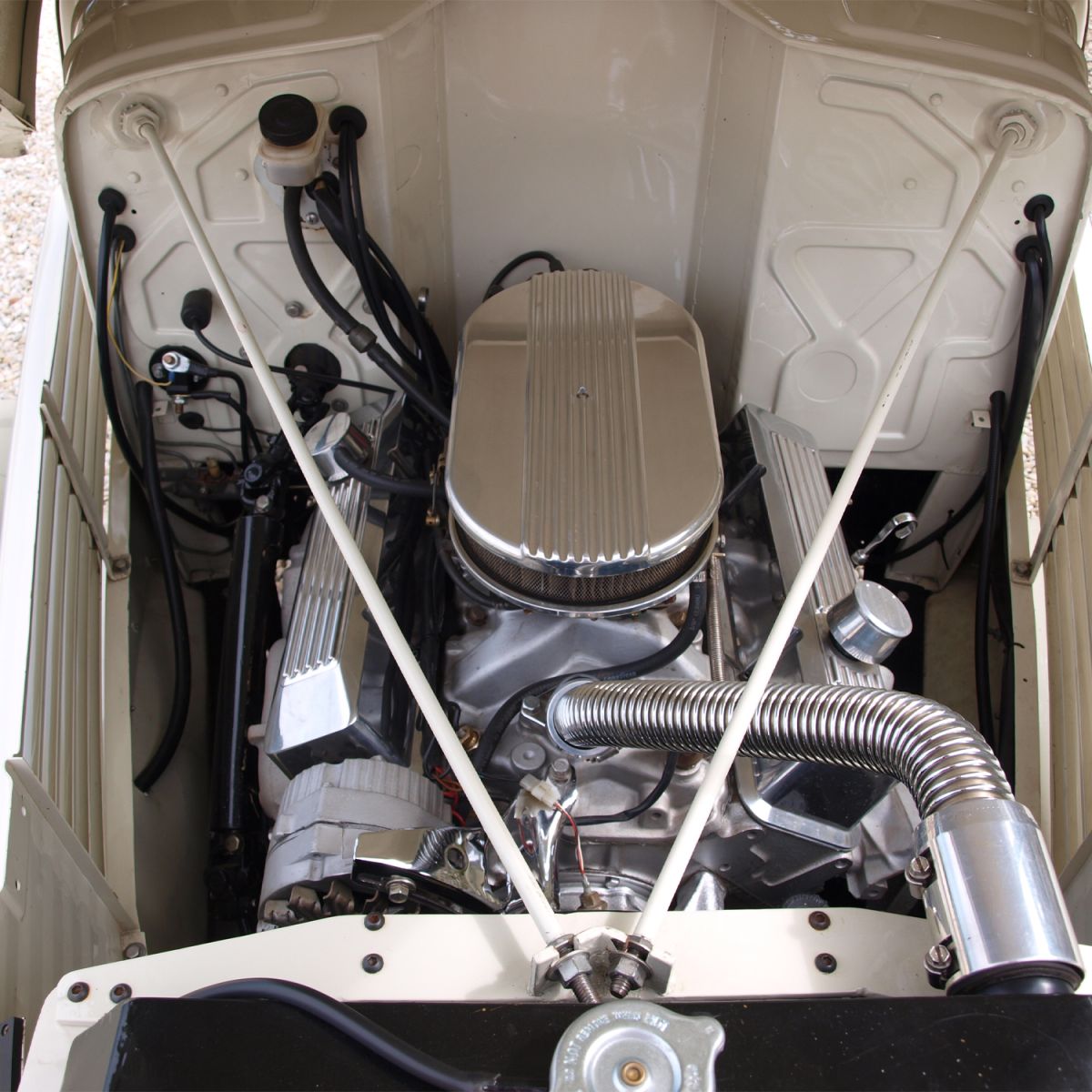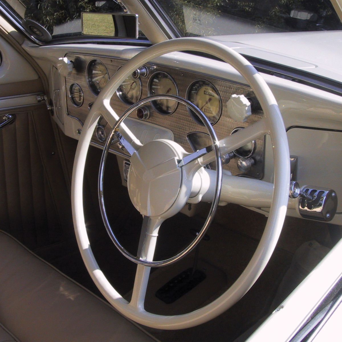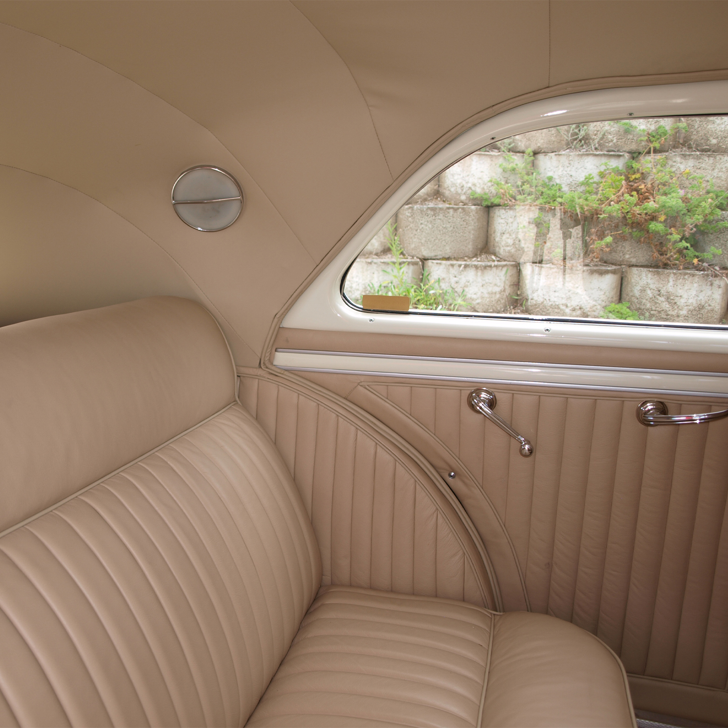 A replica gear stalk (props to Mike again), new woodwork inside, and a ring-polished stainless dash finished things off. The paint? BMW Mini Pepper White. The interior? Beige leather stitched to factory specs. Clean. Classic. Cord.