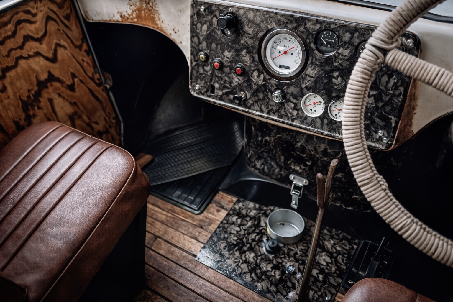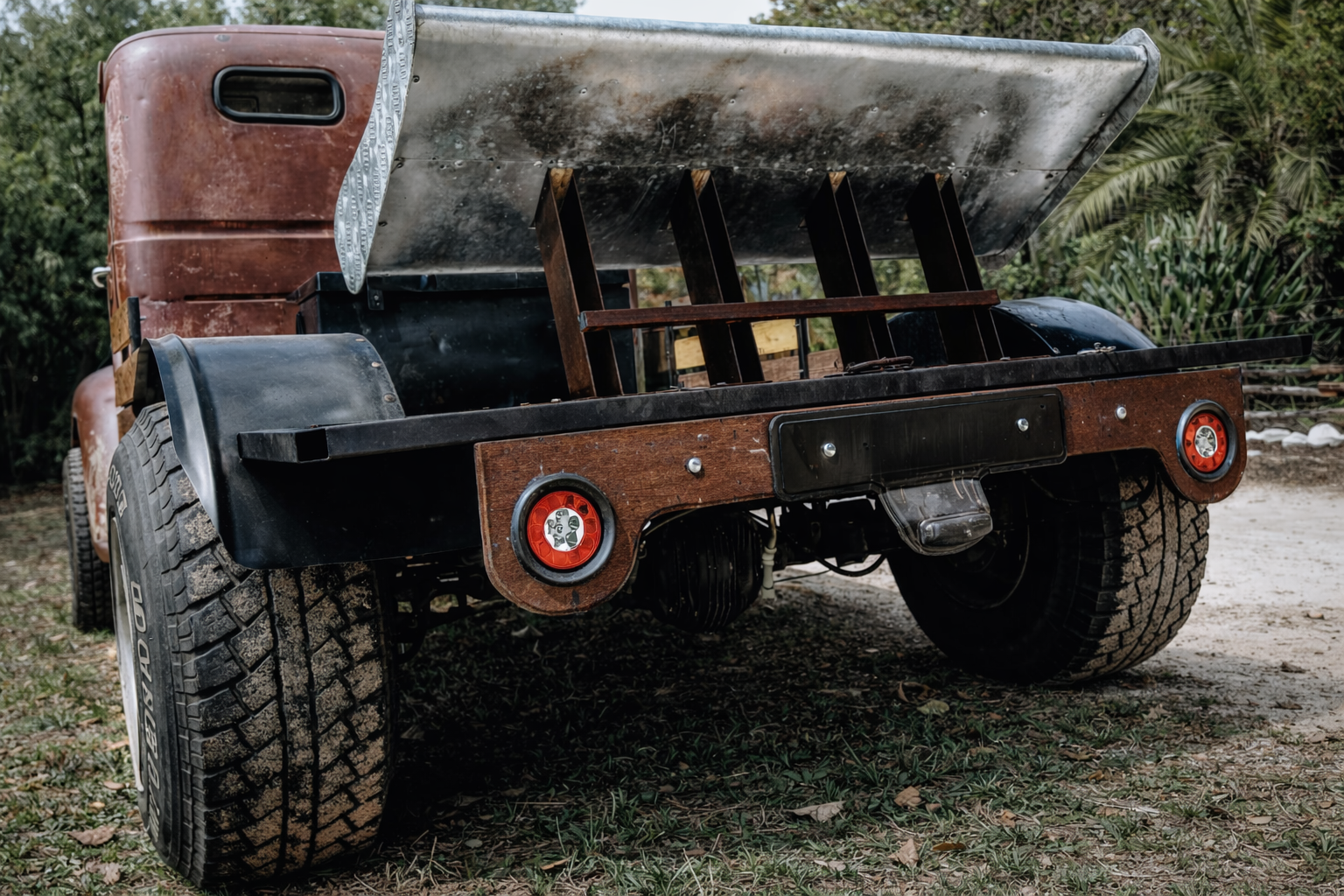 One of the most striking features of “Old Rusty” is its custom-fabricated wheel arches, cleverly formed from old oil drums. This creative reuse of materials adds authentic industrial character while showcasing the builder’s ingenuity. It is a detail that captures the spirit of true custom culture — working with what is available and transforming it into something extraordinary.