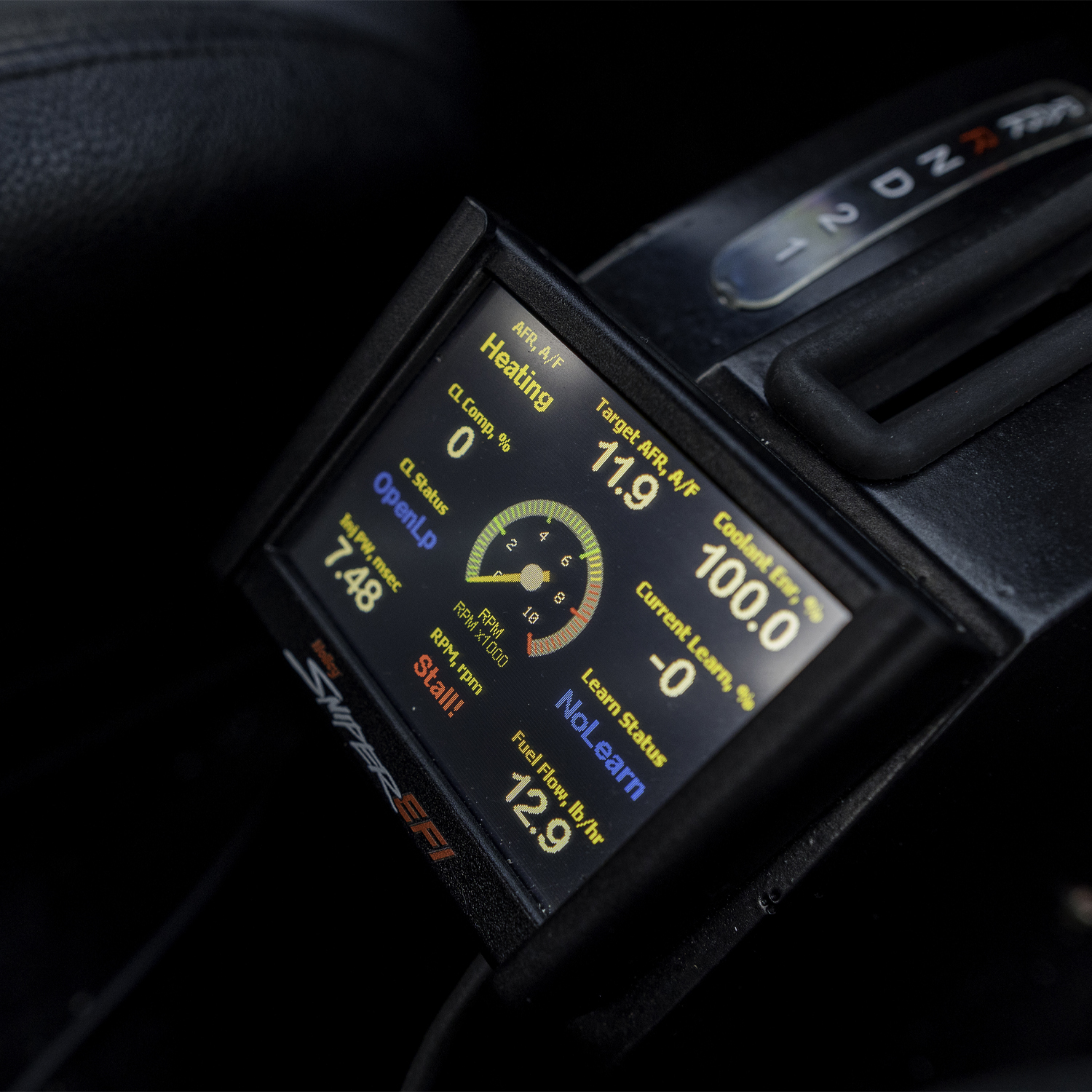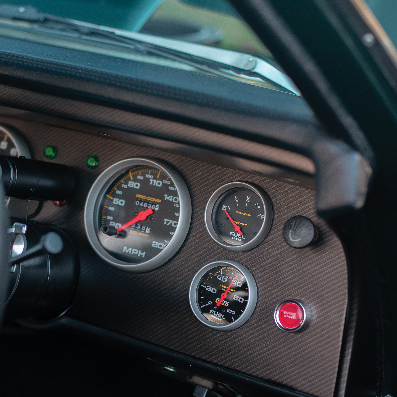With the visuals sorted, the running gear had to match the attitude. The foundation is a virgin 350 four-bolt main block, built into a 383 stroker using Eagle internals, SRP forged pistons, ARP hardware throughout, and Pro Comp cylinder heads. Clevite bearings support the rotating assembly, while Comp hydraulic roller cams, roller rockers, and chromoly pushrods handle valve control. Ignition duties are managed by MSD, and airflow comes via a Victor Junior intake topped with a Holley Sniper EFI system. Exhaust gases exit through custom long-tube headers into a 3-inch stainless steel system with electric cut-outs, giving Scott the option of cruising quietly or letting the car announce itself properly.