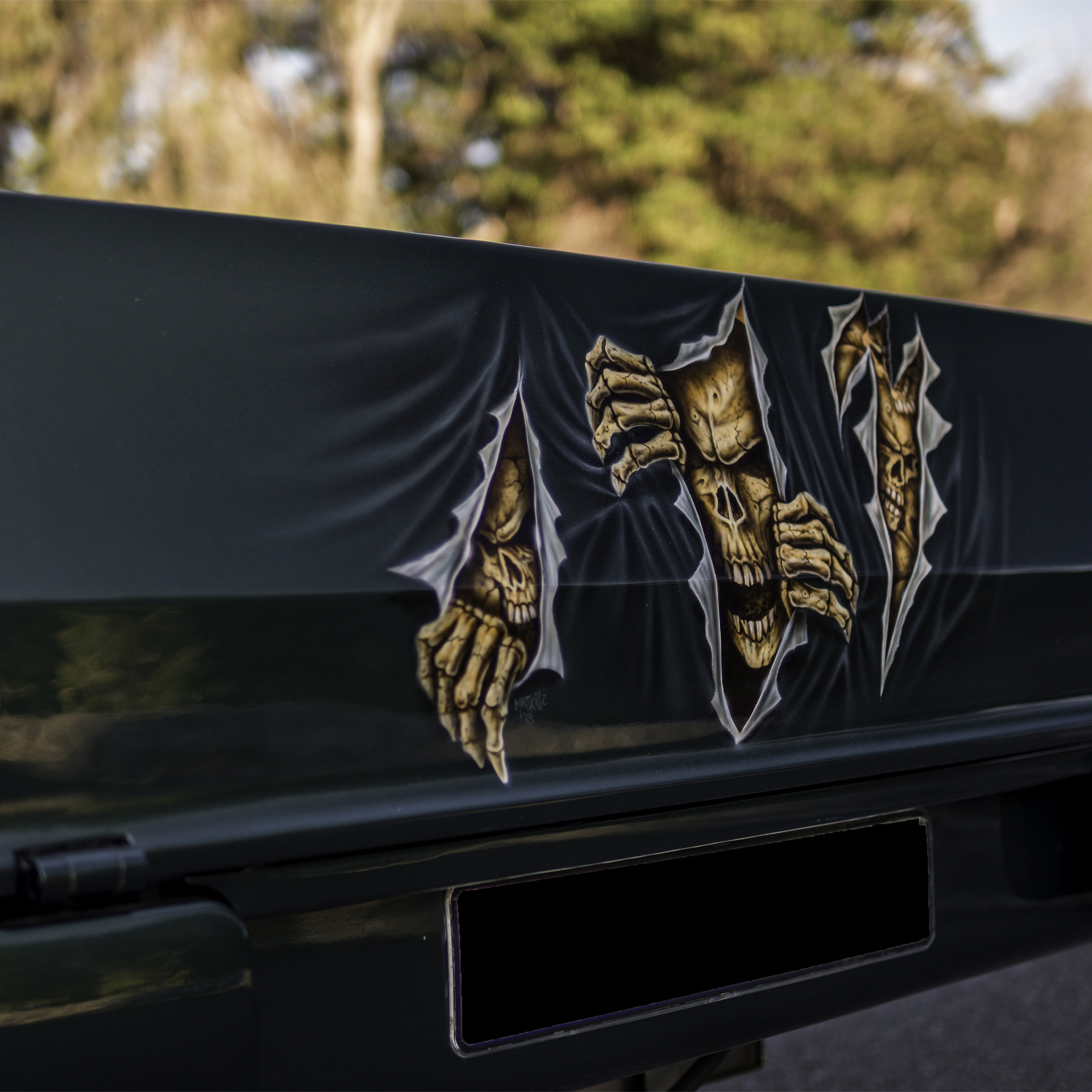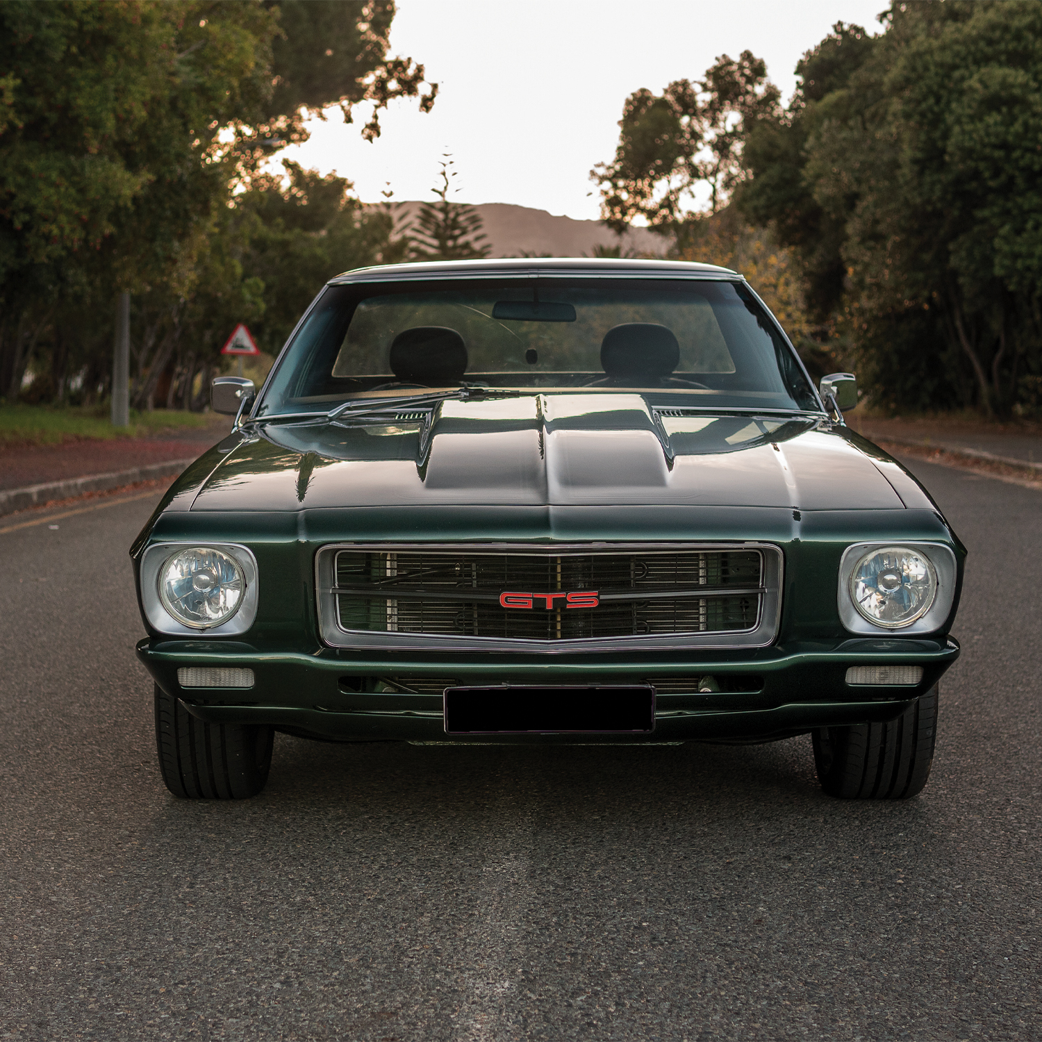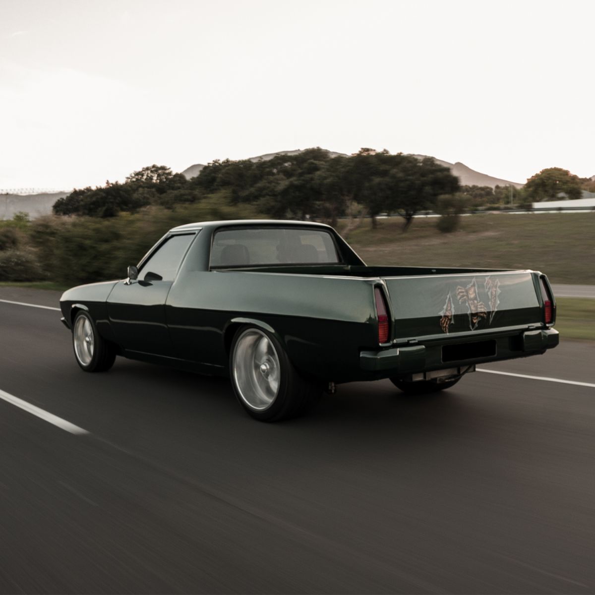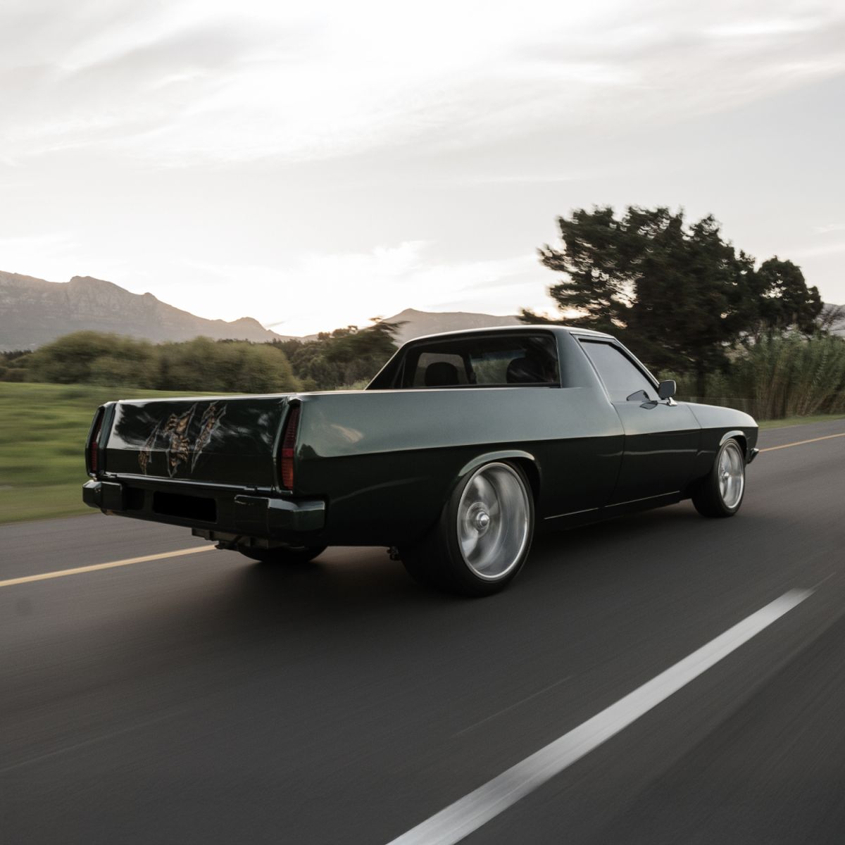 With the metalwork complete, attention shifted to fabrication. The chassis was narrowed and the inner guards tubbed to accommodate massive 20x12-inch wheels at the rear. Scott was very clear about the stance he wanted, aggressive but clean, with no visual clutter. Door handles were shaved and replaced with poppers, rear running lights and bumpers were tightened up for a cleaner fit, and a 2-inch reverse cowl was added to the bonnet to hint at what was hiding underneath. Paint was handled by Reynolds Auto Care in Cape Town, finished in a deep emerald green with a subtle pearl that brings the colour to life in the sun. The choice of green was deliberate, staying close to the original base colour that Scott fell in love with the first time he saw the car. Subtle pinstriping on the cowl and detailed airbrushing on the tailgate finish it off perfectly. A HQ Holden GTS grille was also imported to complete the front-end look.