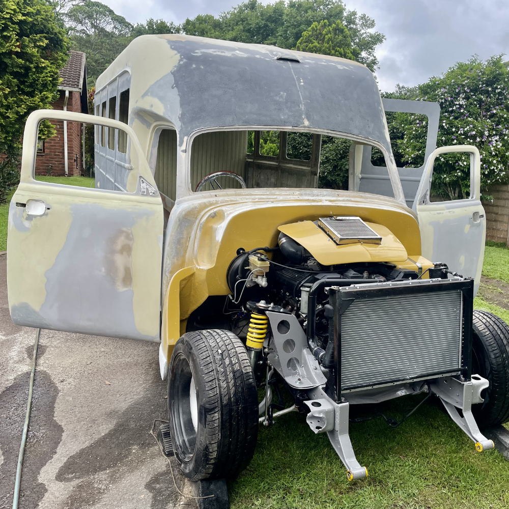 Rather than starting with a complete vehicle, much of the bodywork was crafted by hand. Over the course of three years, late nights and weekends were dedicated to making moulds, laminating fibreglass, and shaping panels to achieve the iconic school bus profile.