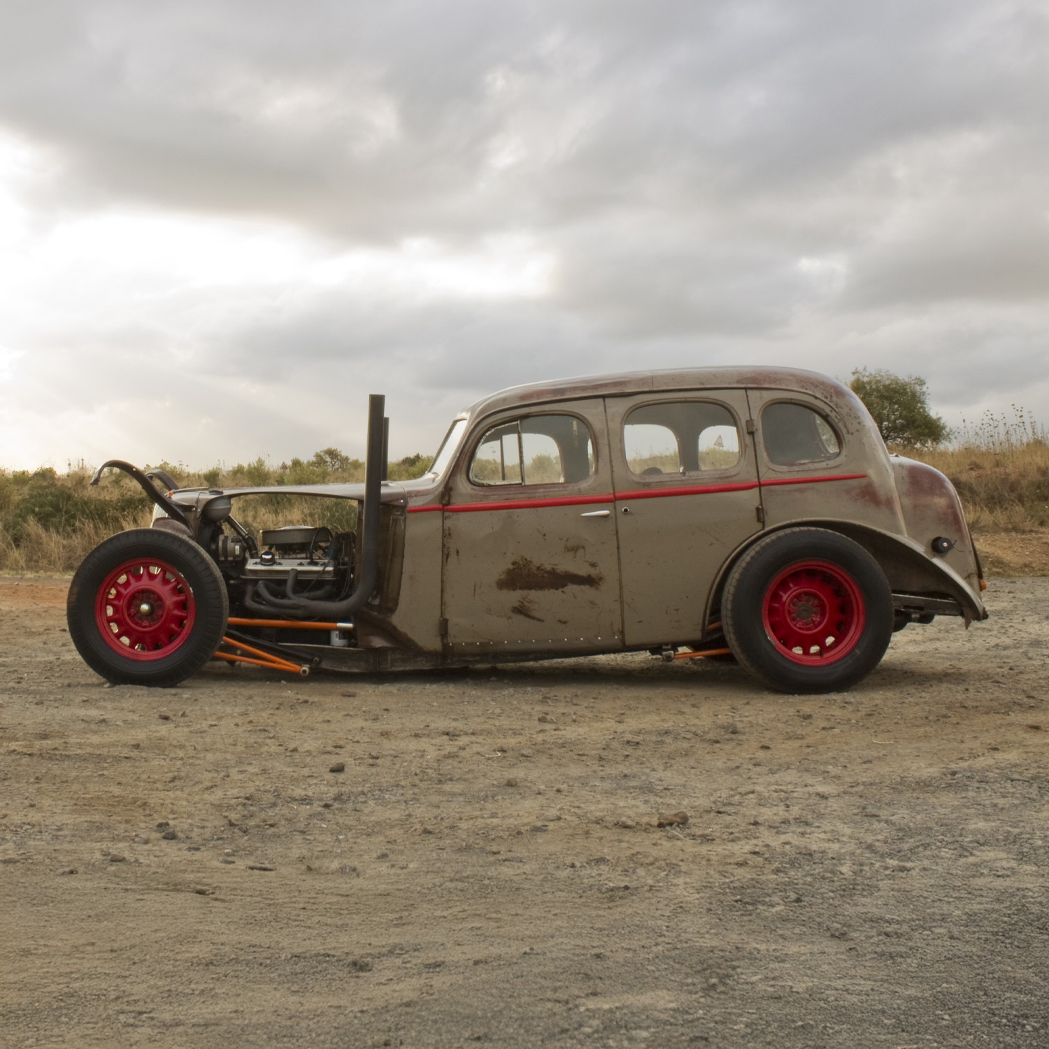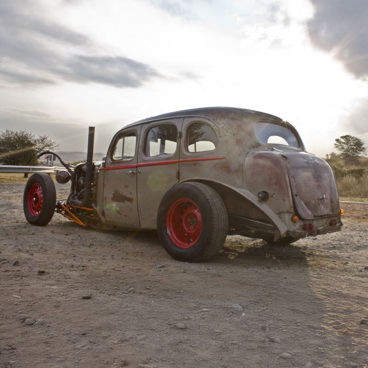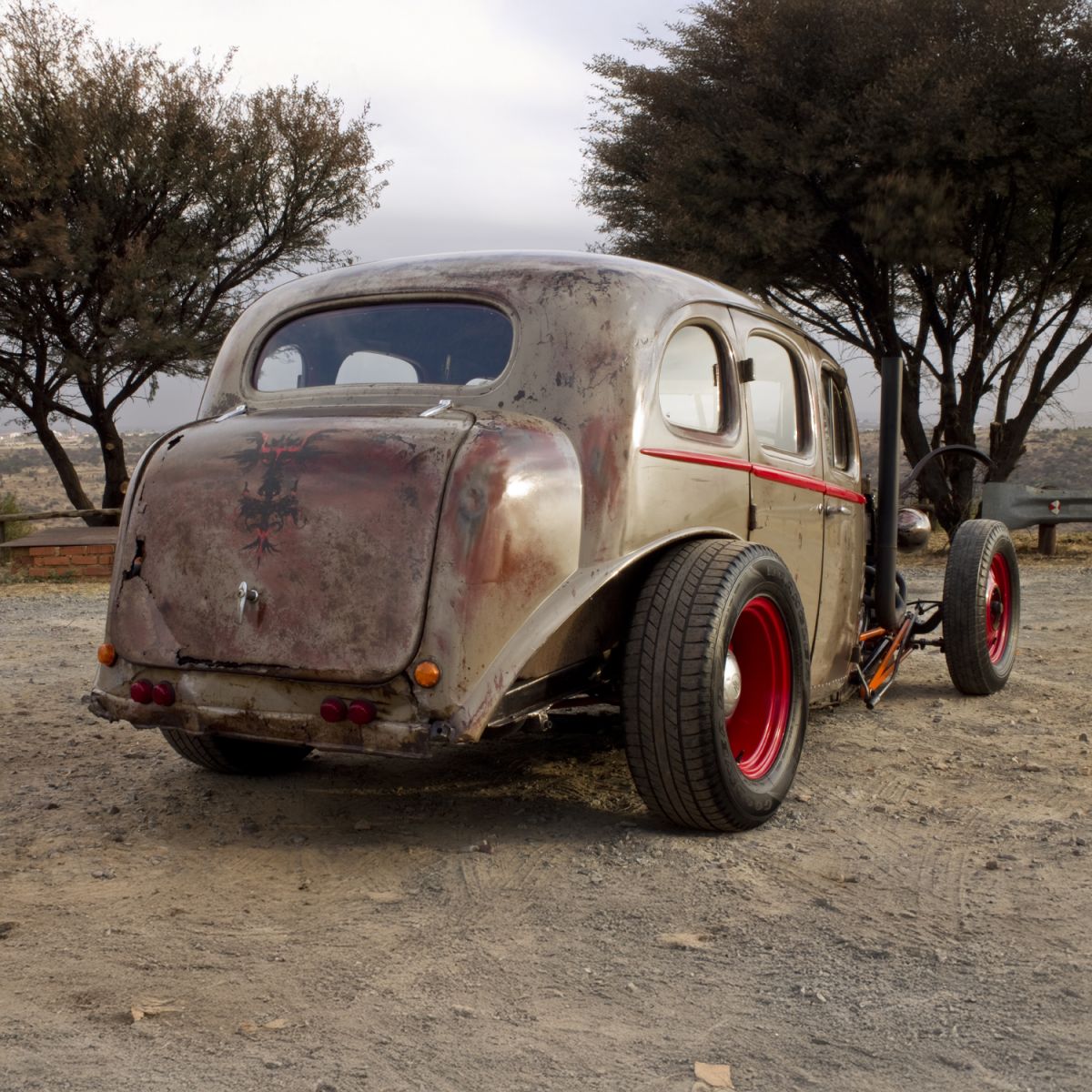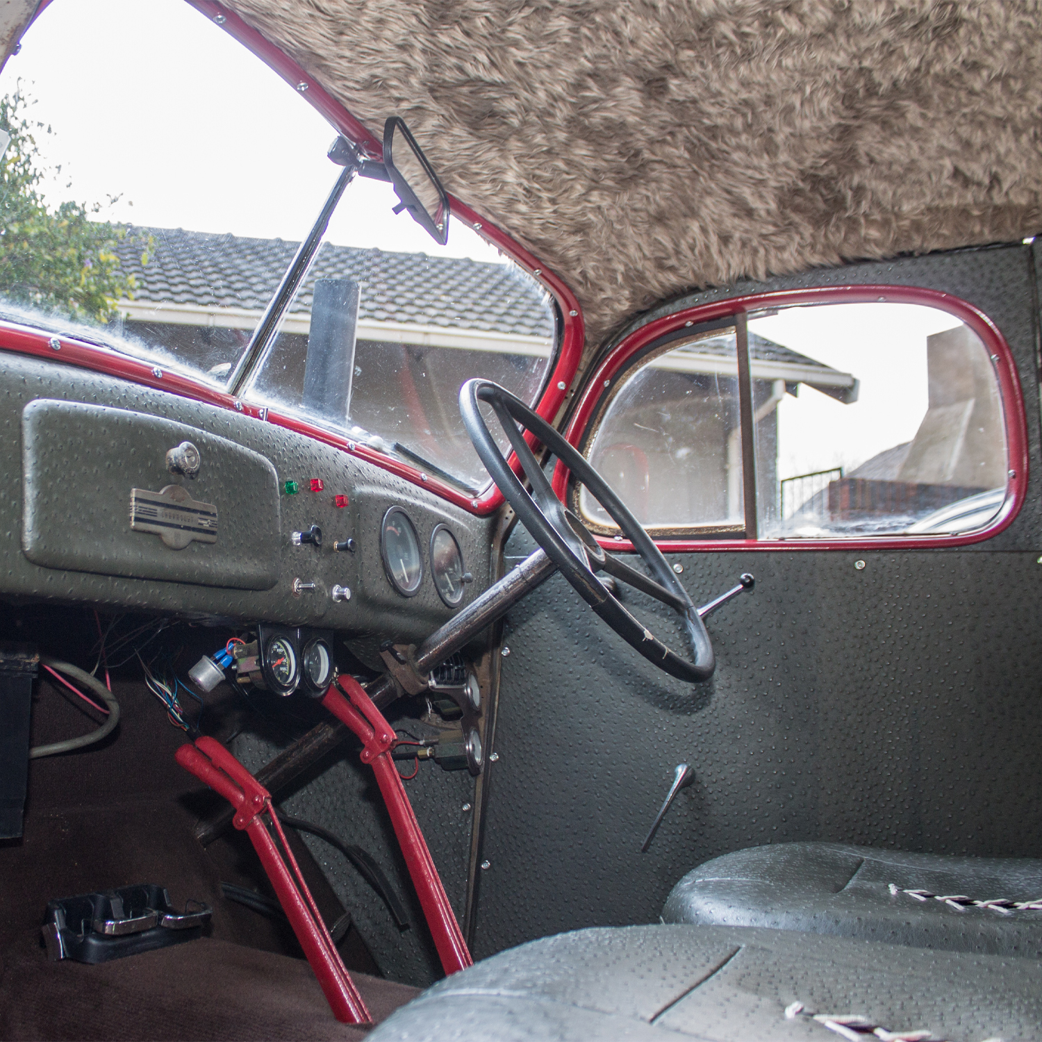 The floor was completely gone, so Danie fabricated a new one that could house the propshaft, internally mounted air suspension and rear diff. The doors were rebuilt from within, retaining only their skins. The center B-pillar was removed to open up the cabin and give easier access, and the body was lowered onto the chassis to create its unmistakable stance. The original patina — more than eight decades of weathering — was preserved under clear coat rather than covered over. The chassis remains original, strengthened and sealed in clear as well.
