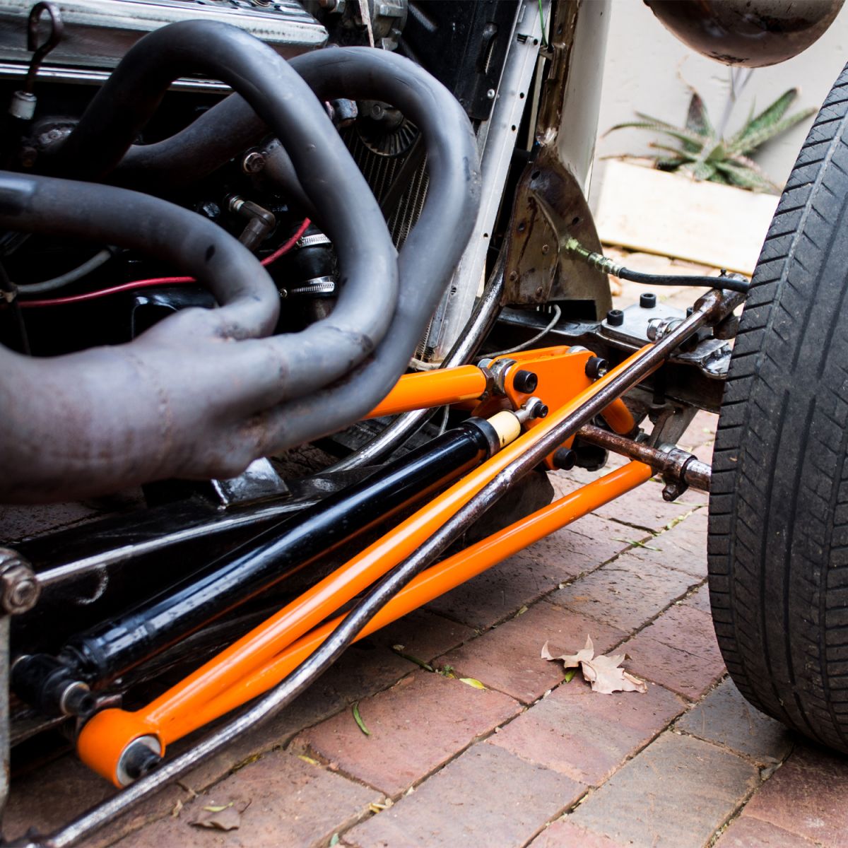 The suspension setup is where Danie’s imagination truly takes over. The original solid front axle stays in place, but the air suspension is mounted inside the cabin and linked to the front end via pushrods and a mechanical linkage system. The shock absorbers are mounted horizontally. The rear is a four-link setup running matching hidden air. From the outside, the car maintains its traditional old-school look — but the ride is entirely modern.
