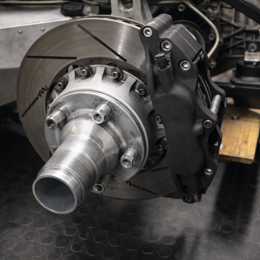 The car is equipped with Vari 6-pot front brake calipers paired with floating discs. This type of setup is commonly used in motorsport and high-performance applications because it provides superior braking consistency and heat management.