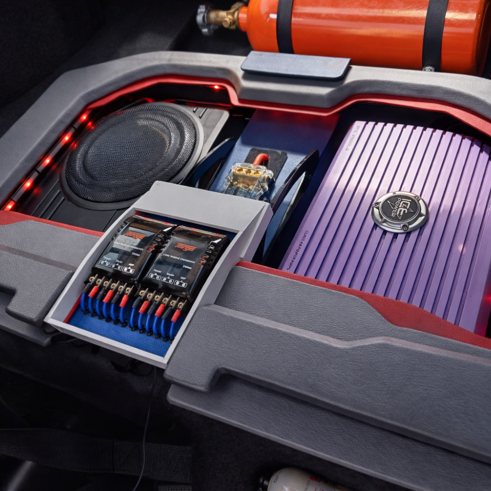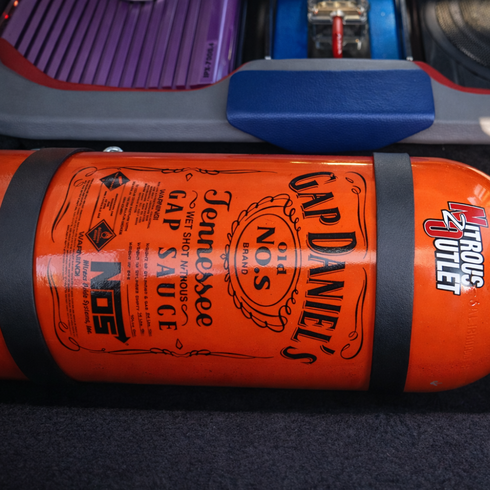 A full rear seat delete allowed for a custom enclosure housing the nitrous bottle, amplifier, and active subwoofer—while still retaining a functional false floor for daily usability. The audio system balances enjoyment over competition, driven by a Sony DSX-B700 double-DIN head unit, custom wiring, distribution blocks, and a neatly integrated control layout.
