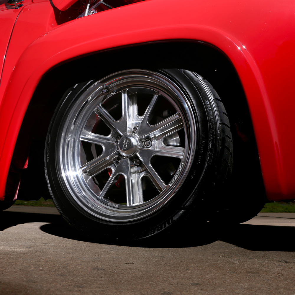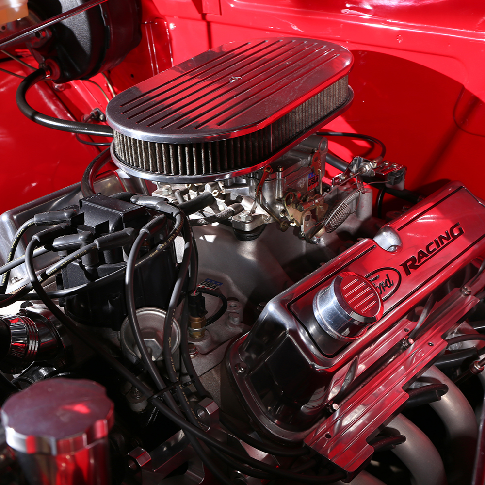 The truck’s deep red paintwork is perfectly complemented by the chrome accents across the exterior — from the grille and bumpers to the striking Shelby Cobra-style 18-inch American Racing wheels. The bed has also been beautifully finished with rosewood-stained marine-grade wood, which sits above a custom aluminium 97-litre fuel tank.