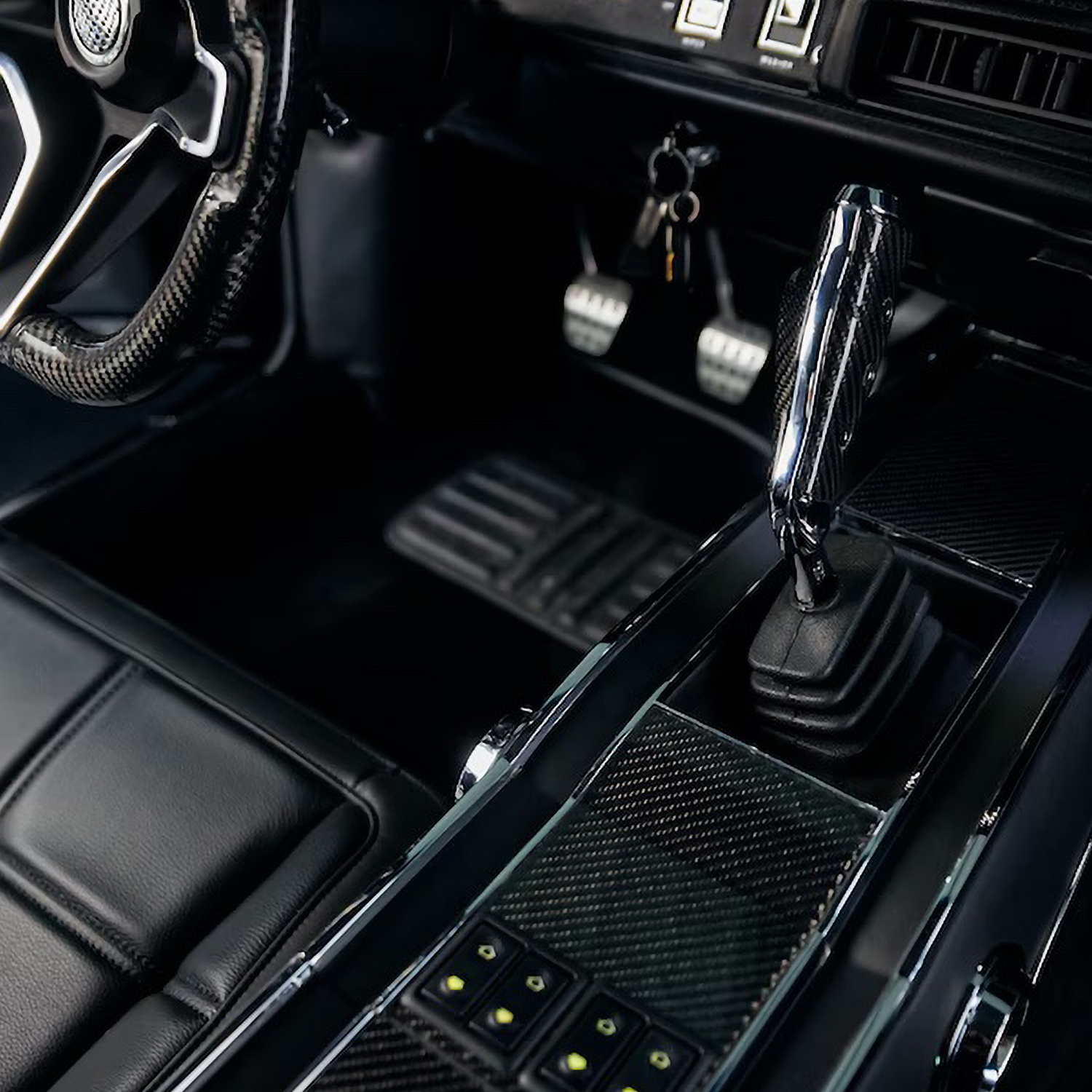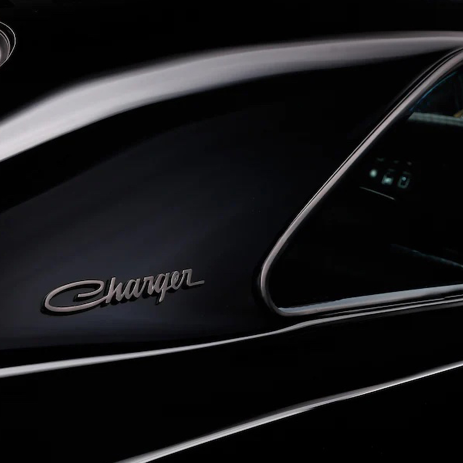 A custom Roadster Shop FAST TRACK chassis brings dynamic performance to the foreground. The Charger features Fox RS SV coilovers at all four corners with ample stopping power thanks to Baer Brakes Extreme 6S six-piston calipers. To aid in dissipating brake heat, the front fenders feature machined billet side vents, and the Charger rides on Ringbrothers “TUSK” Edition HRE Wheels wrapped in Michelin Pilot Sport 4S tires. The same meticulous approach extends to the interior with modern comforts and conveniences, including a custom leather interior with a carbon-fiber console and, in true Mopar fashion, a custom carbon-fiber “pistol grip” shifter.
