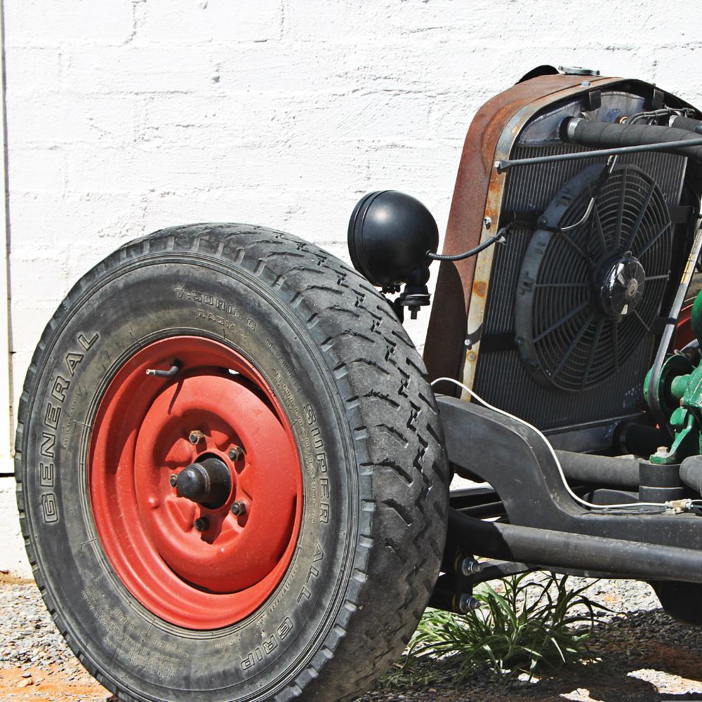 The radiator itself was custom-built using a Land Cruiser core with aluminium tanks. A 1930s International truck cowl was adapted, and what was meant to be an air cleaner ended up as a grille mascot thanks to time constraints. The lake pipes were hand-fabricated by Henry from 1.6mm mild steel — with just two days to spare.