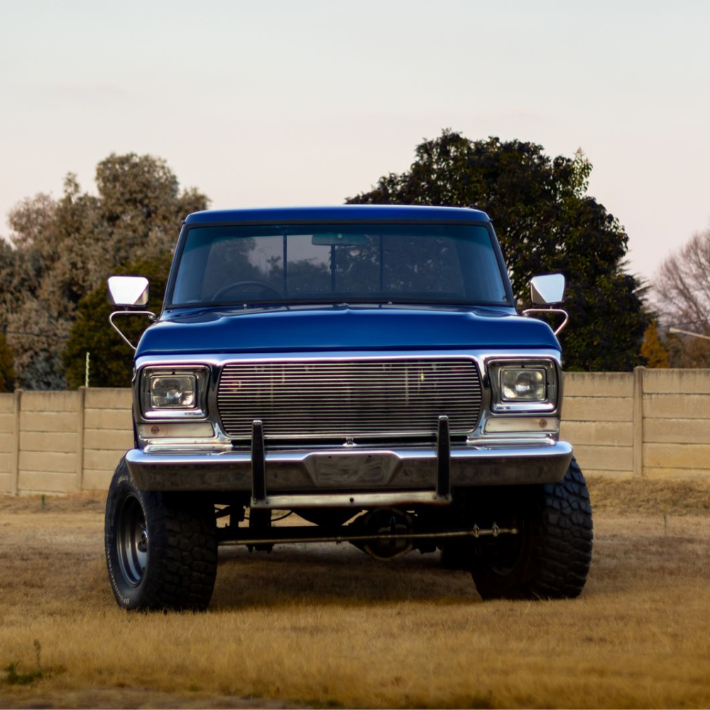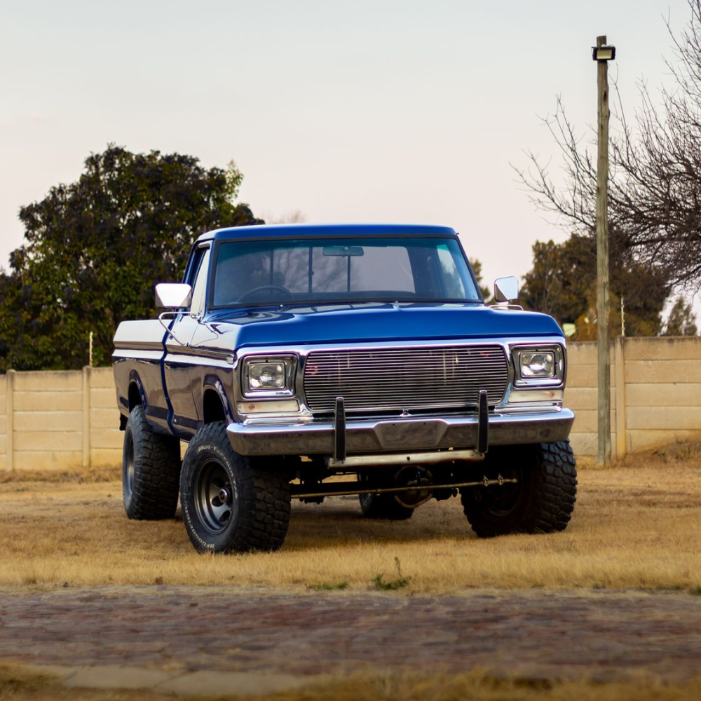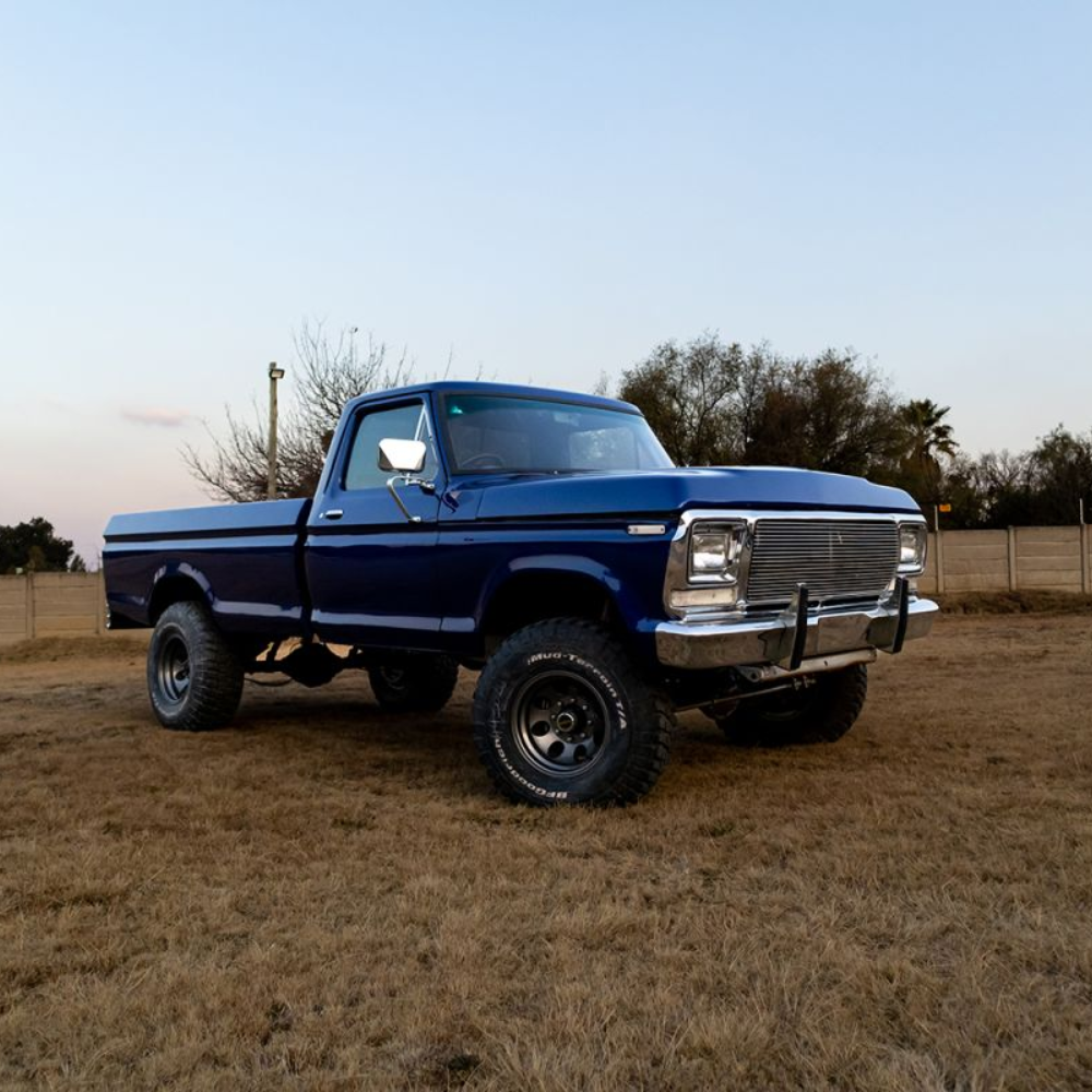 The F250 came with a Ford V8 351 Winsor with an original 4-speed box. Neil rebuilt the motor himself and added a bunch of new parts. This included stainless steel headers, a Holley four-barrel cab, a Dress up kit, and MSD dizzy and coils. A new fabricated stainless performance exhaust was fabricated by Wimpie at Steelroad. The material was supplied by Jacksons distribution. Also, the petrol tank was relined by Villieria Radiators in Pretoria.