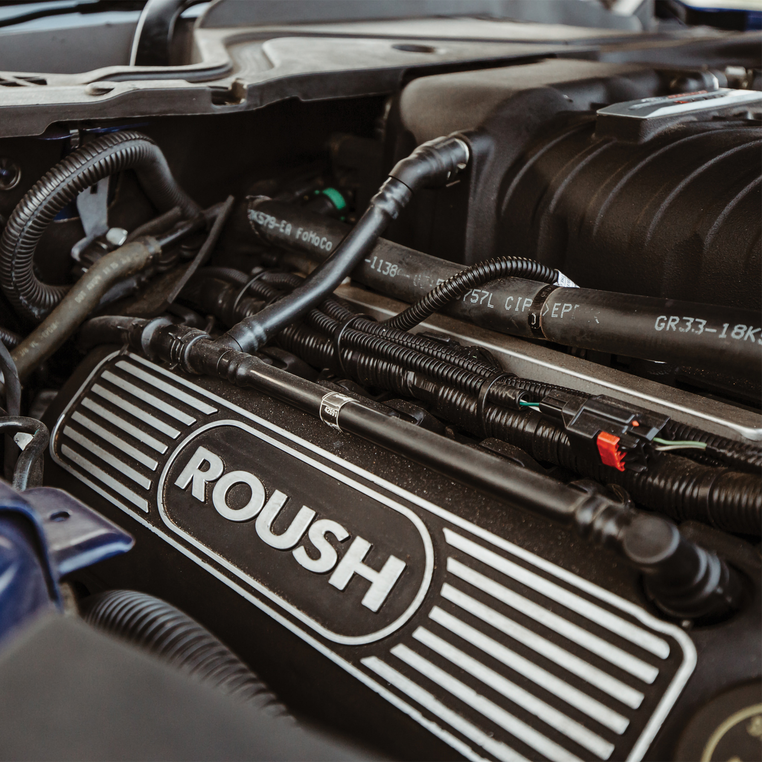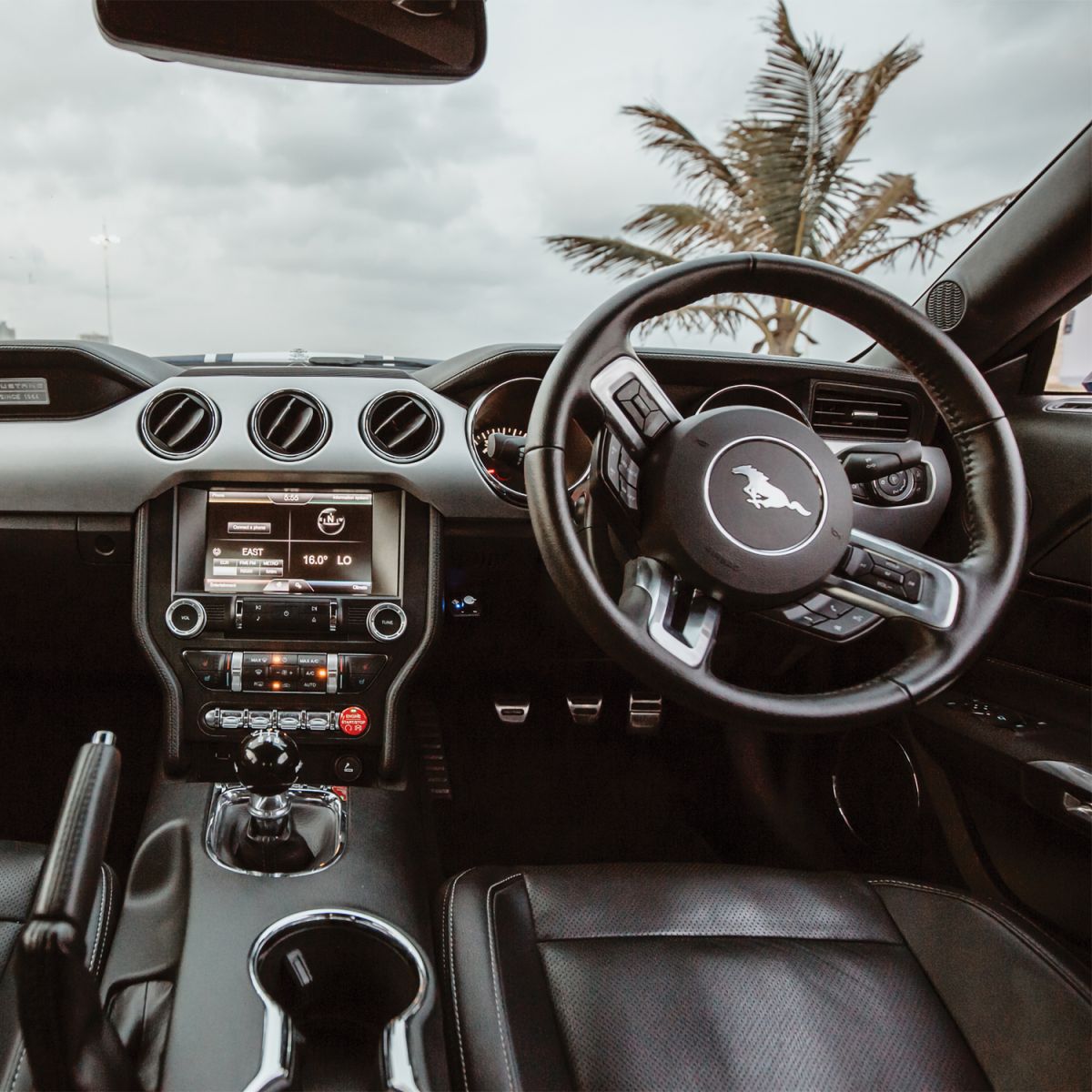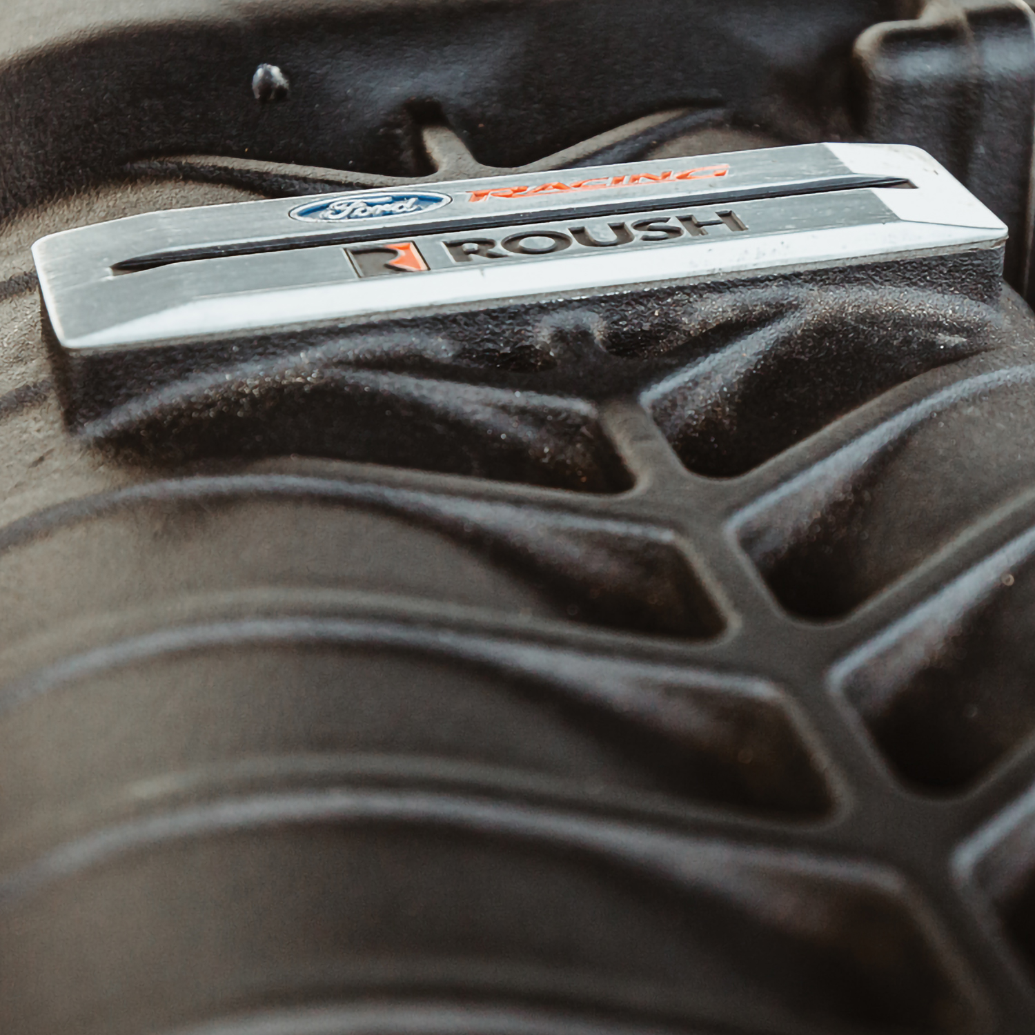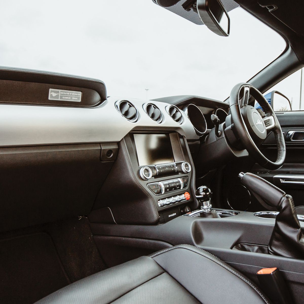 The brakes were not replaced as the Brembos that came with the car do an excellent job. Greg’s Garage did the engine rebuild. The part specification on the motor is a Ford Coyote 5.0L with a Roush supercharger. The fitment of the supercharger is pretty straightforward. Greg said that there were a few challenging bits which were more difficult than what was shown in the instructions. The interior and seats are standard Ford. He fitted a Roush short shift kit which really helps with the fast gear changes.