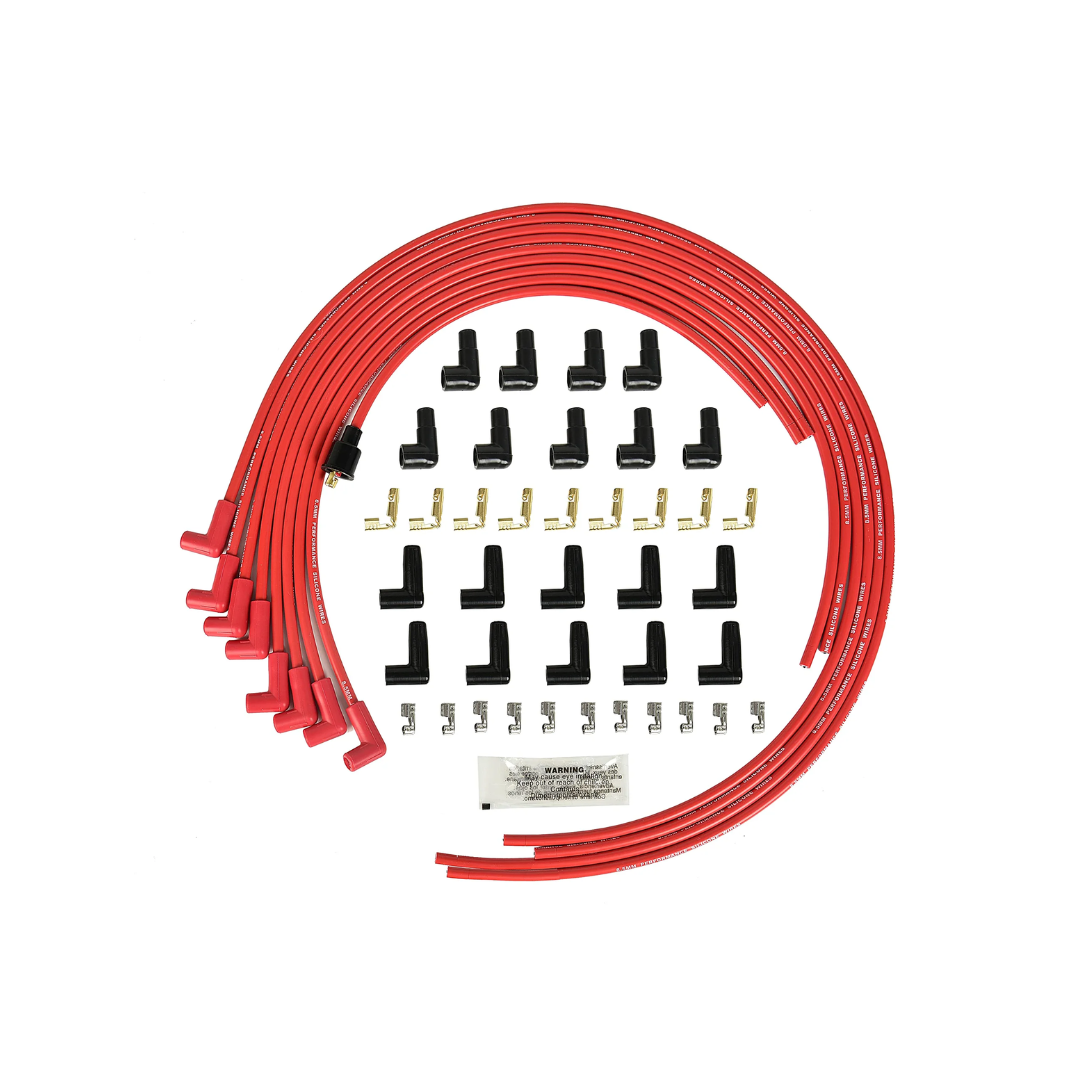 8.5mm Universal Ignition Wire Set. 100% silicone jacket, and a .080" spiral wound core for maximum spark transfer and noise suppression. Includes coil wire, terminals and boots for socket or HEI-style distributor caps. 90 Degree spark plug boots